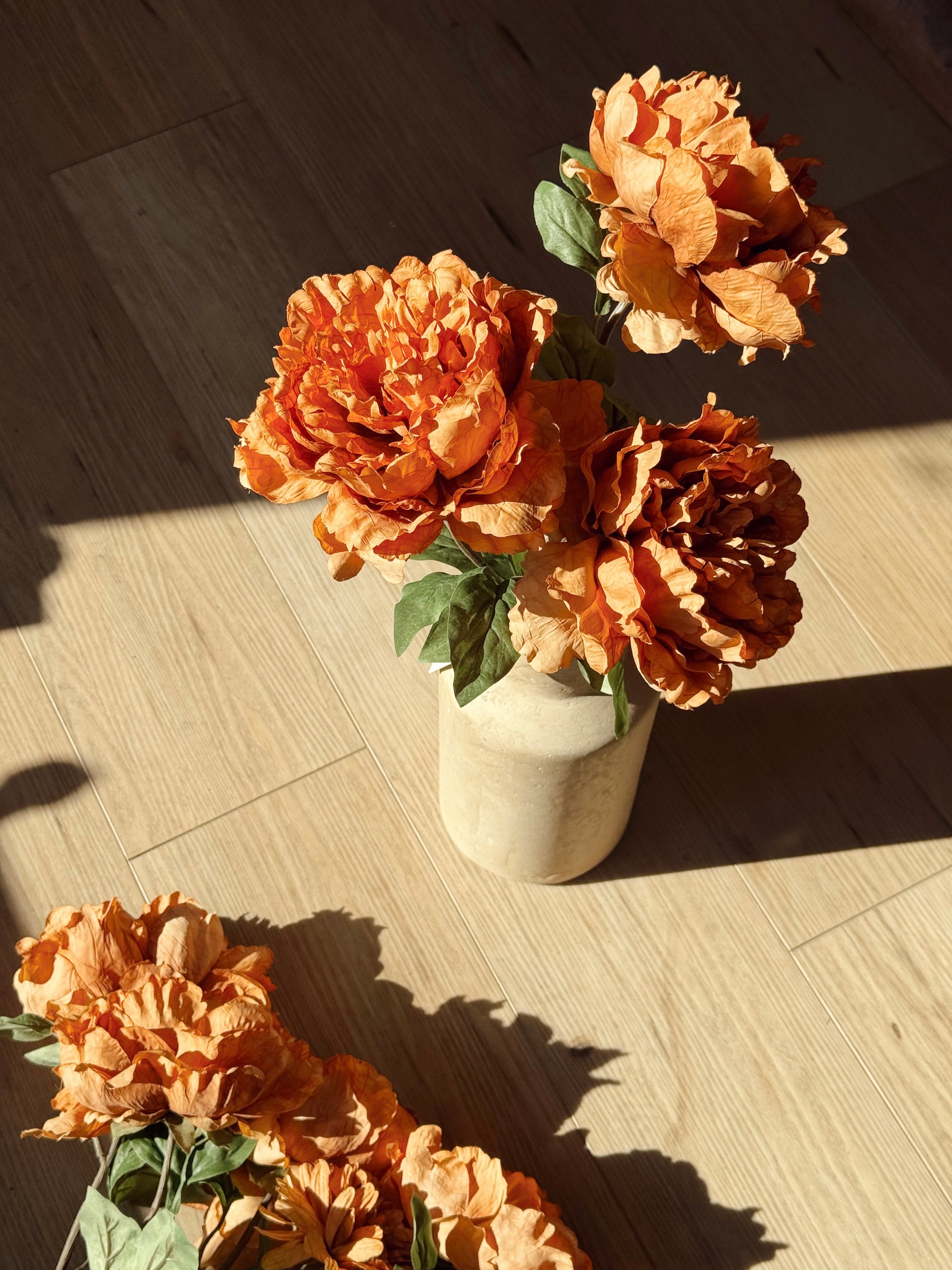 Add rich autumnal charm to your home with this Dusty Orange Peony Stem by Ragon House. Standing 27” tall, each stem features a full, layered peony bloom in a soft, rustic orange tone that captures the beauty of fall foliage. The textured petals and lifelike green leaves create a realistic look, making it a perfect choice for seasonal arrangements or year-round warmth.