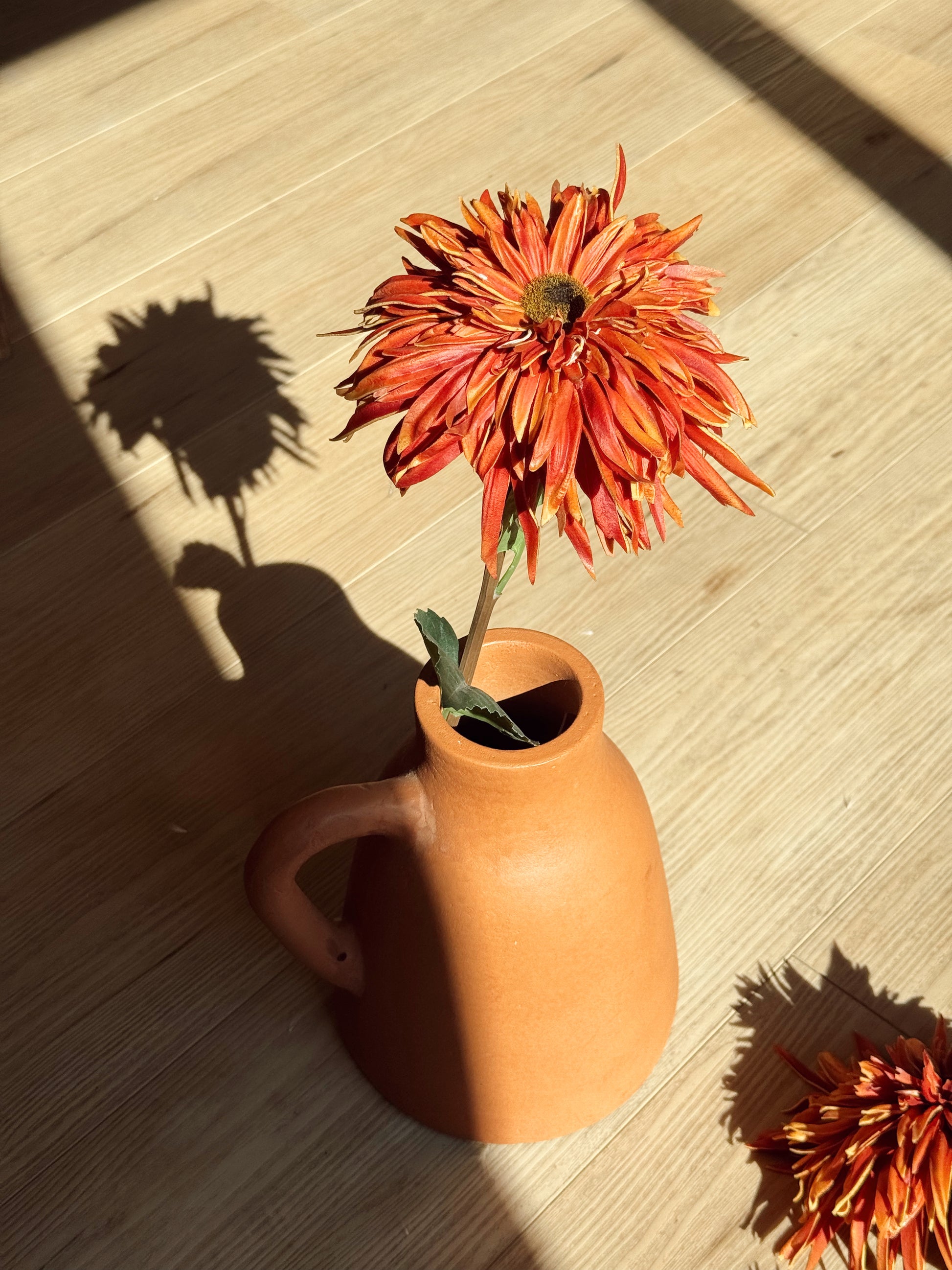 Bring a touch of autumn warmth into your home with this lifelike Sienna Spider Gerbera Daisy Stem by Ragon House. Featuring fiery tones of burnt orange and sienna, each layered petal captures the beauty of a fresh-cut bloom in full color. At 24.5” tall, this stem is perfect for displaying solo in a slender vase or grouped together for a bold, seasonal arrangement. The realistic green leaves and sturdy stem make it a versatile accent for farmhouse, rustic, or modern décor.