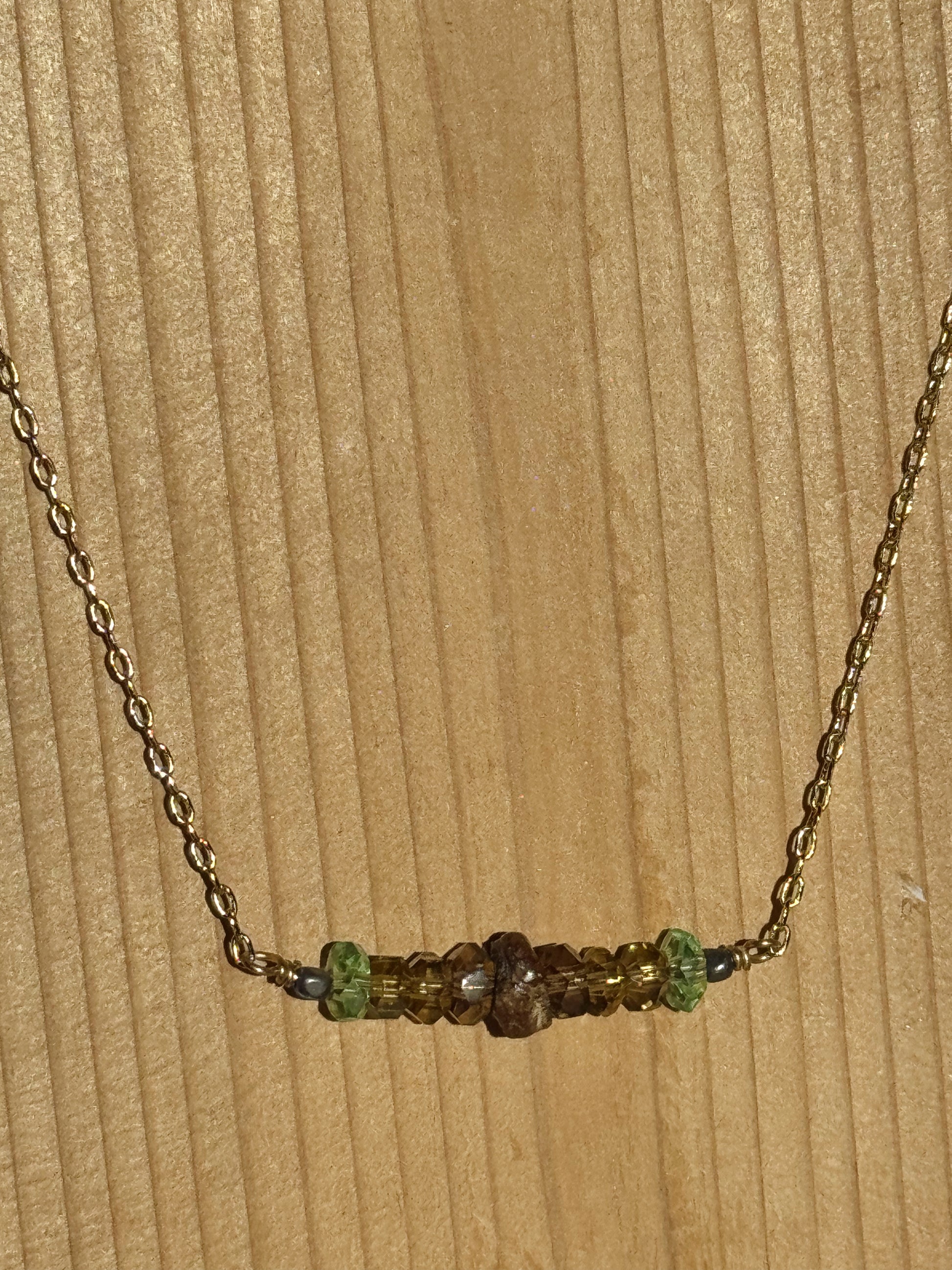 This handcrafted 17” necklace by designer Sarah H Designs captures the serene beauty of nature through its earthy tones and delicate sparkle. Featuring a row of green and amber crystal beads centered around a raw jasper stone, it’s strung on a dainty gold-plated chain for a touch of elegance. The secure hook clasp adds a subtle artisanal detail, making it perfect for both everyday wear and special occasions.