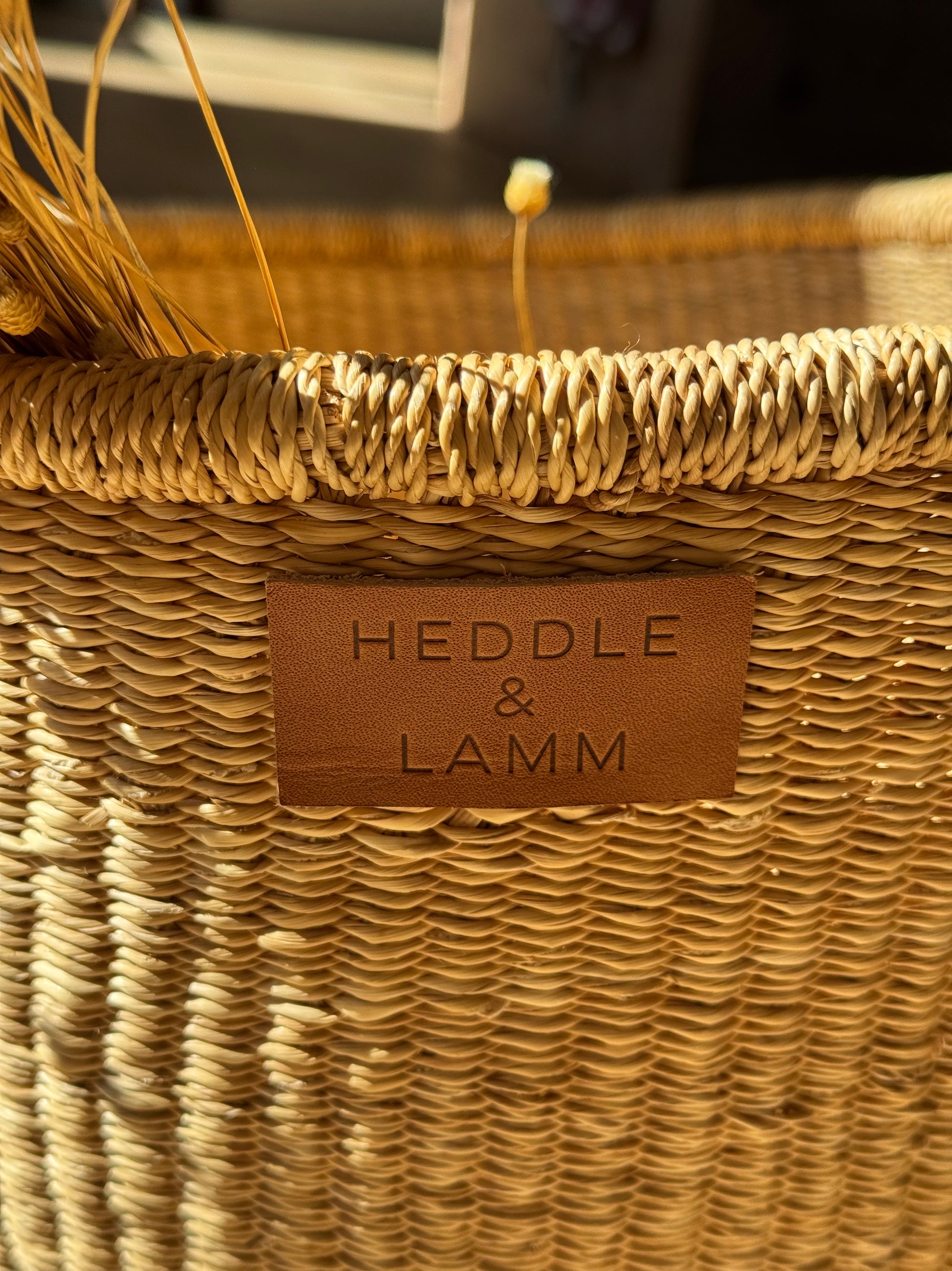 Handwoven in the Bolgatanga region of northern Ghana, the Kandiga Bolga Basket by Heddle & Lamm is a timeless piece of functional art. Crafted from sustainably sourced elephant grass and finished with a rich reddish-brown leather handle, each basket is as sturdy as it is beautiful.