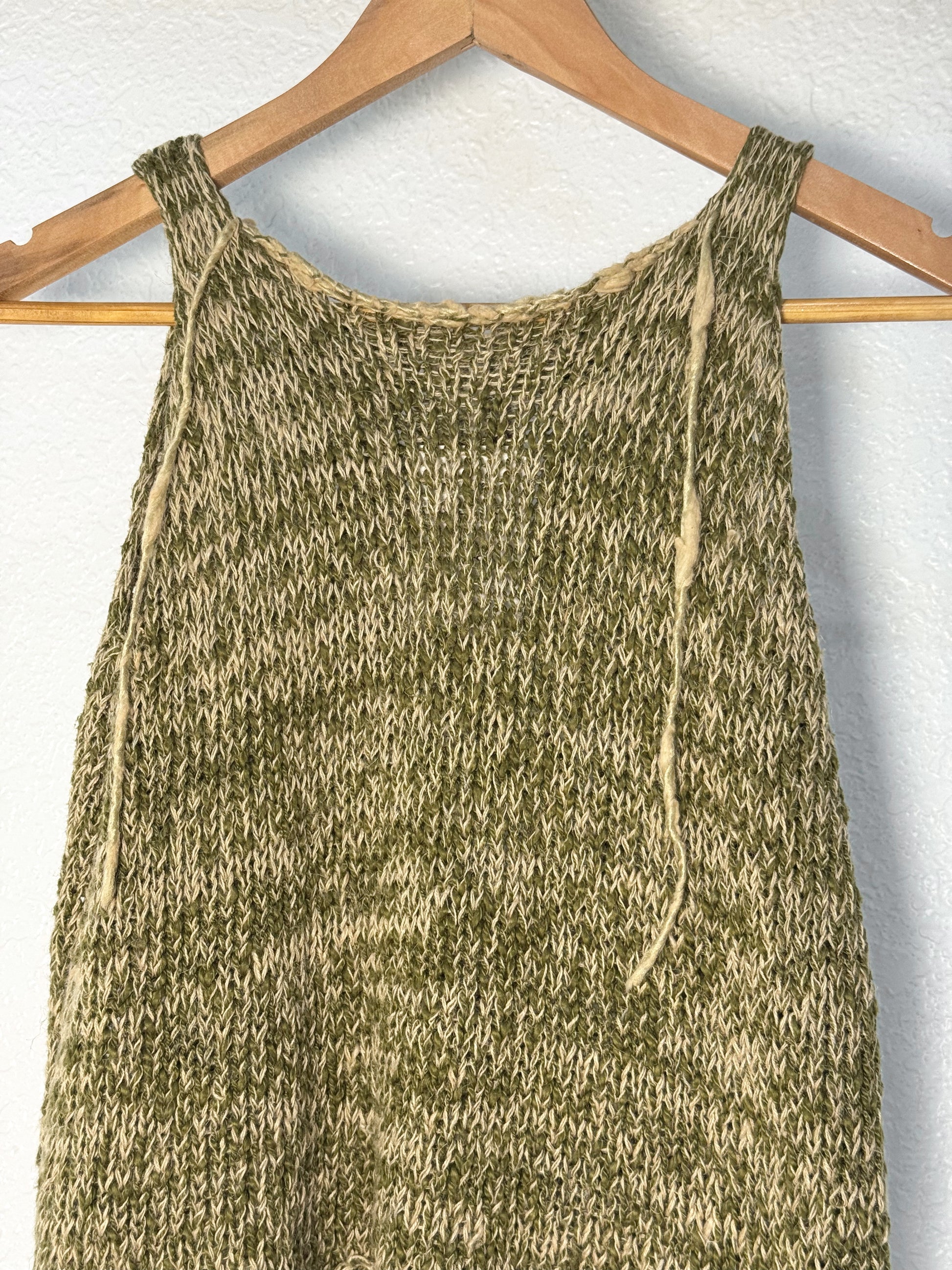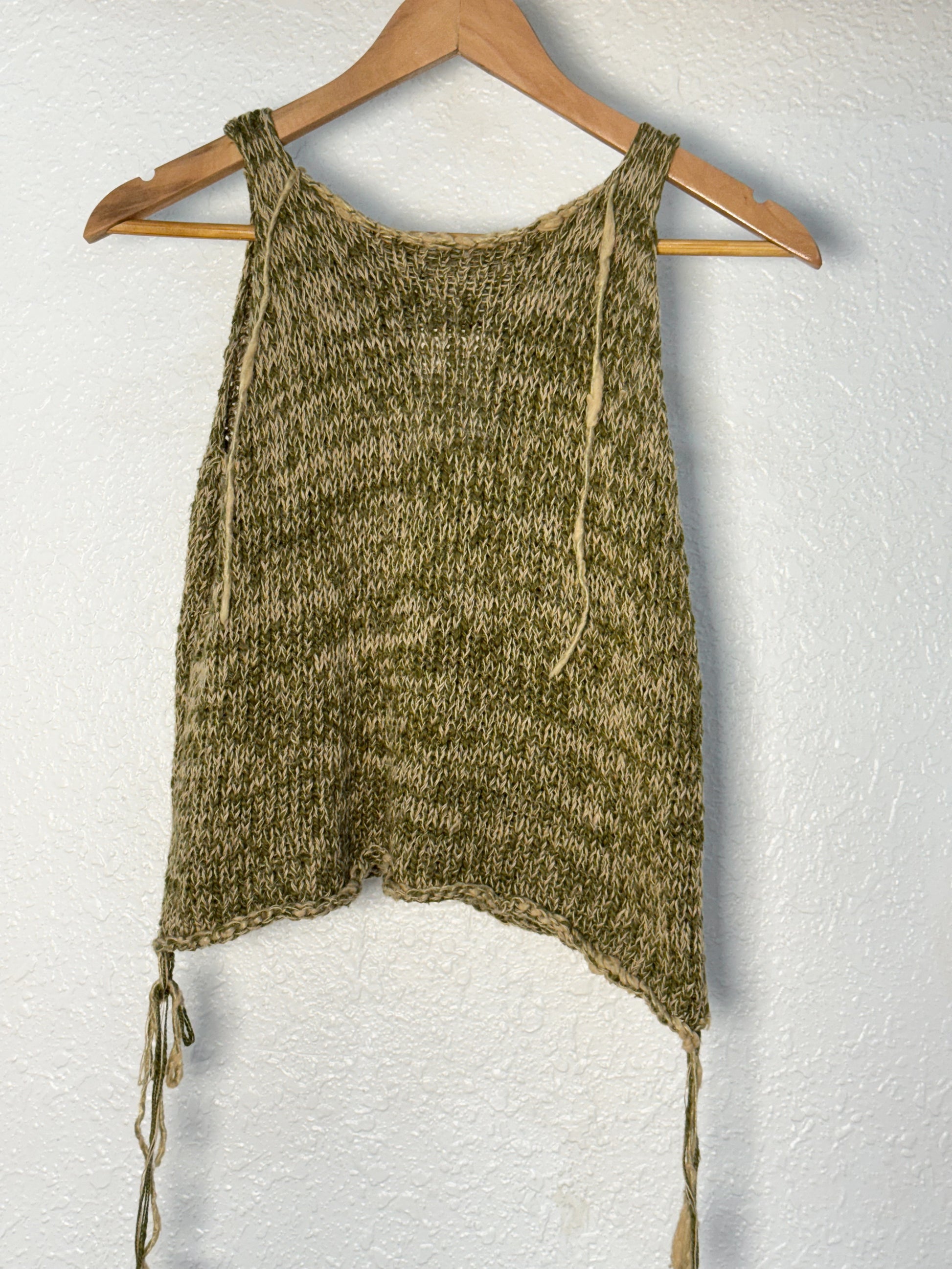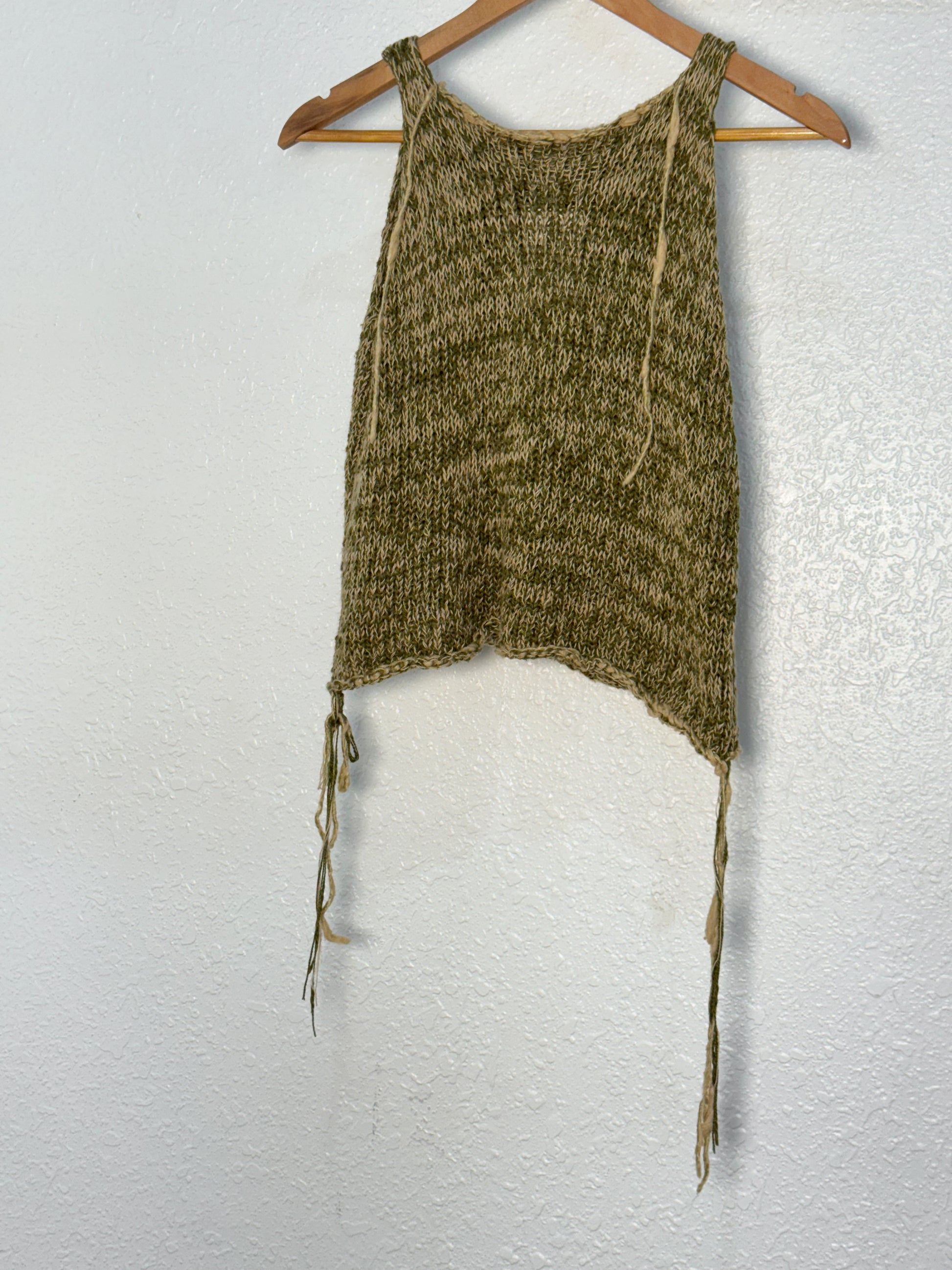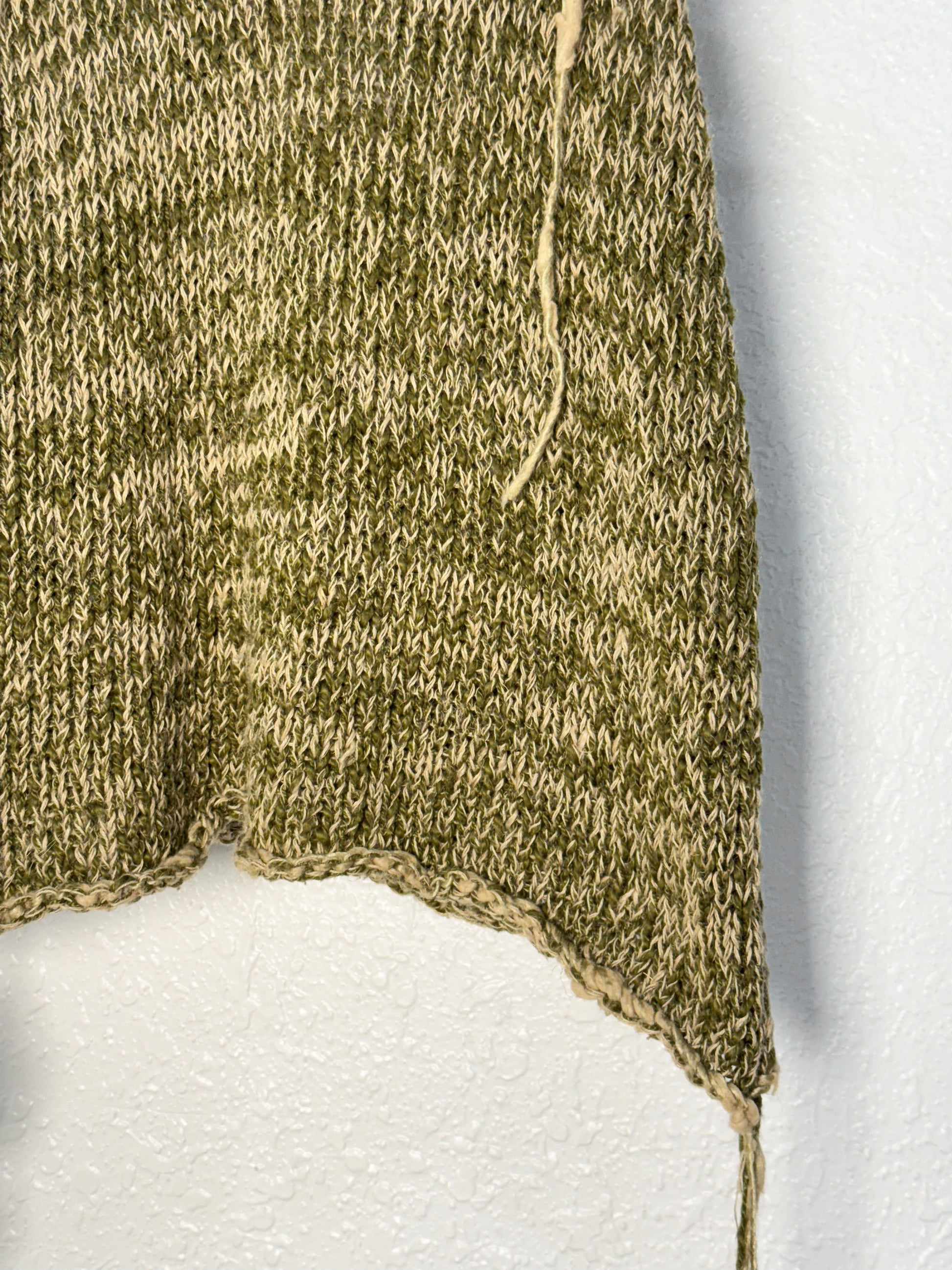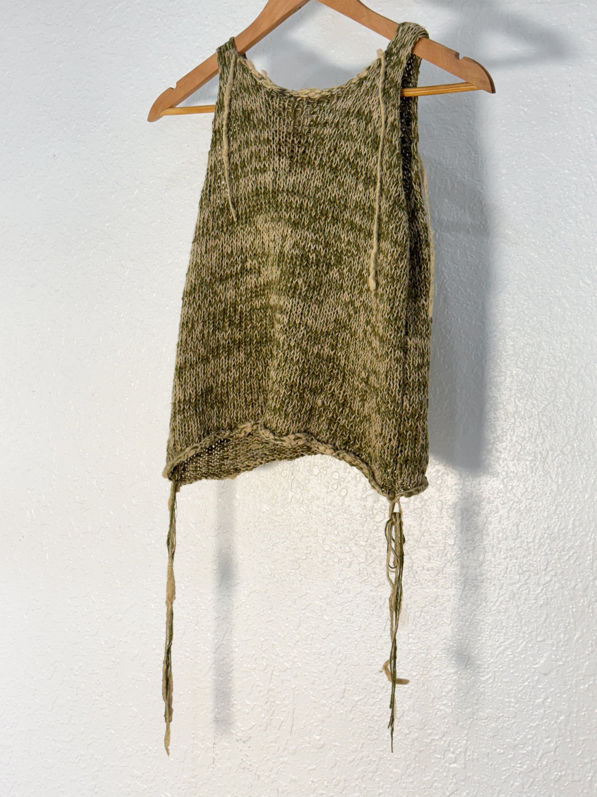 A rare, artisanal piece from Katherine Maxwell Design, this handcrafted knit tank blends earthy olive and natural cream tones in a loosely woven texture. The asymmetrical hem, braided tie accents, and organic fiber blend give it a perfectly imperfect edge—raw, elevated, and unmistakably one-of-a-kind. A statement layering piece for warm days or breezy nights.