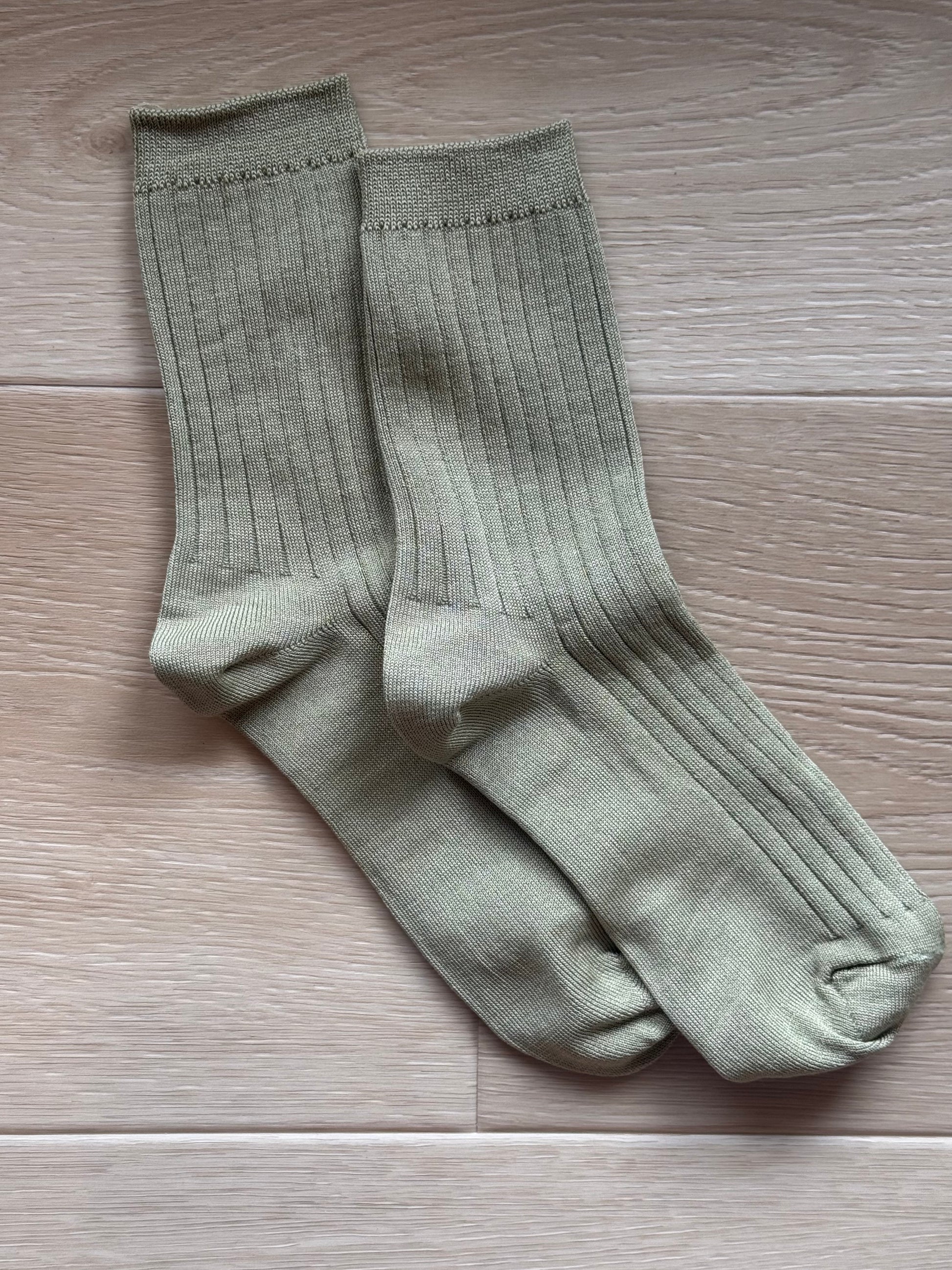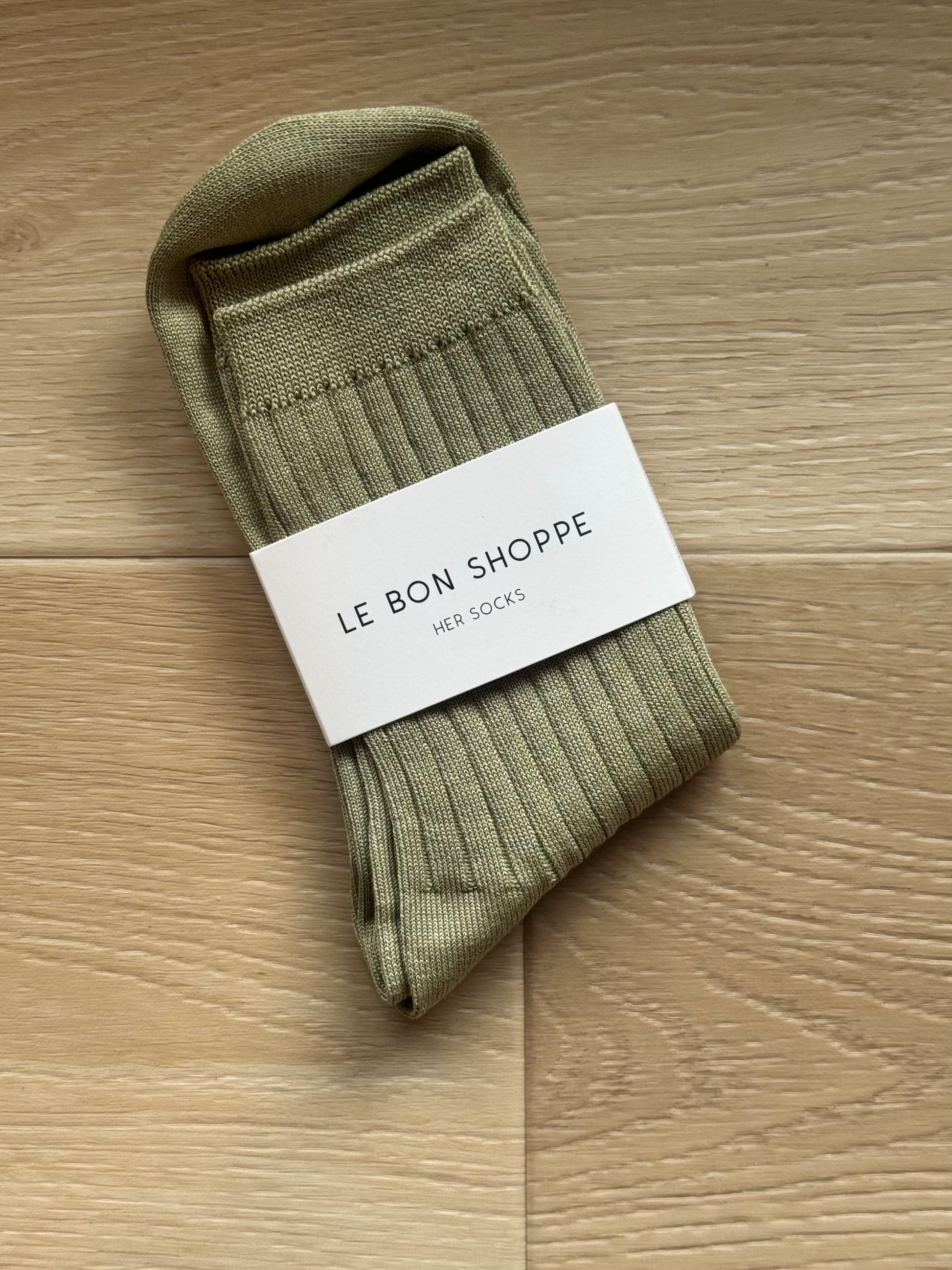 Add a fresh pop of color to your everyday essentials with Le Bon Shoppe’s Her Socks in the soft, muted “Avocado” shade. Made from mercerized combed cotton for a luxe, breathable feel, these ribbed crew socks are designed to blend comfort and effortless style. A go-to pair for sneakers, clogs, or lounging around the house, they’re the perfect finishing touch for any cozy, curated look.