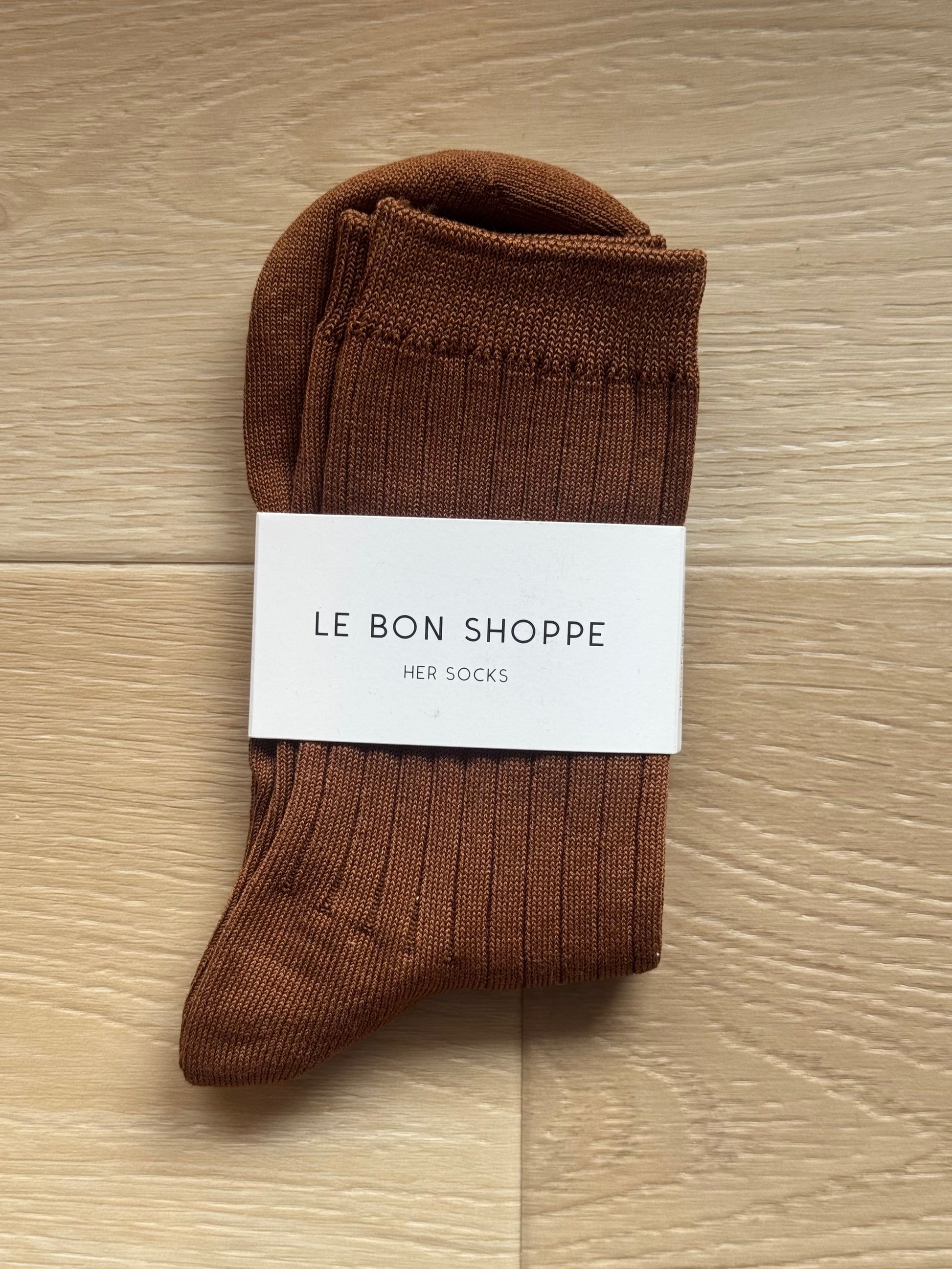 Warm up your look with the earthy richness of Her Socks by Le Bon Shoppe in “Dijon.” This cozy brownish-gold shade adds a grounding, vintage-inspired touch to any outfit—perfect for pairing with boots, sneakers, or clogs. Made from mercerized combed cotton for all-day softness and breathability, these ribbed crew socks offer both comfort and timeless style.