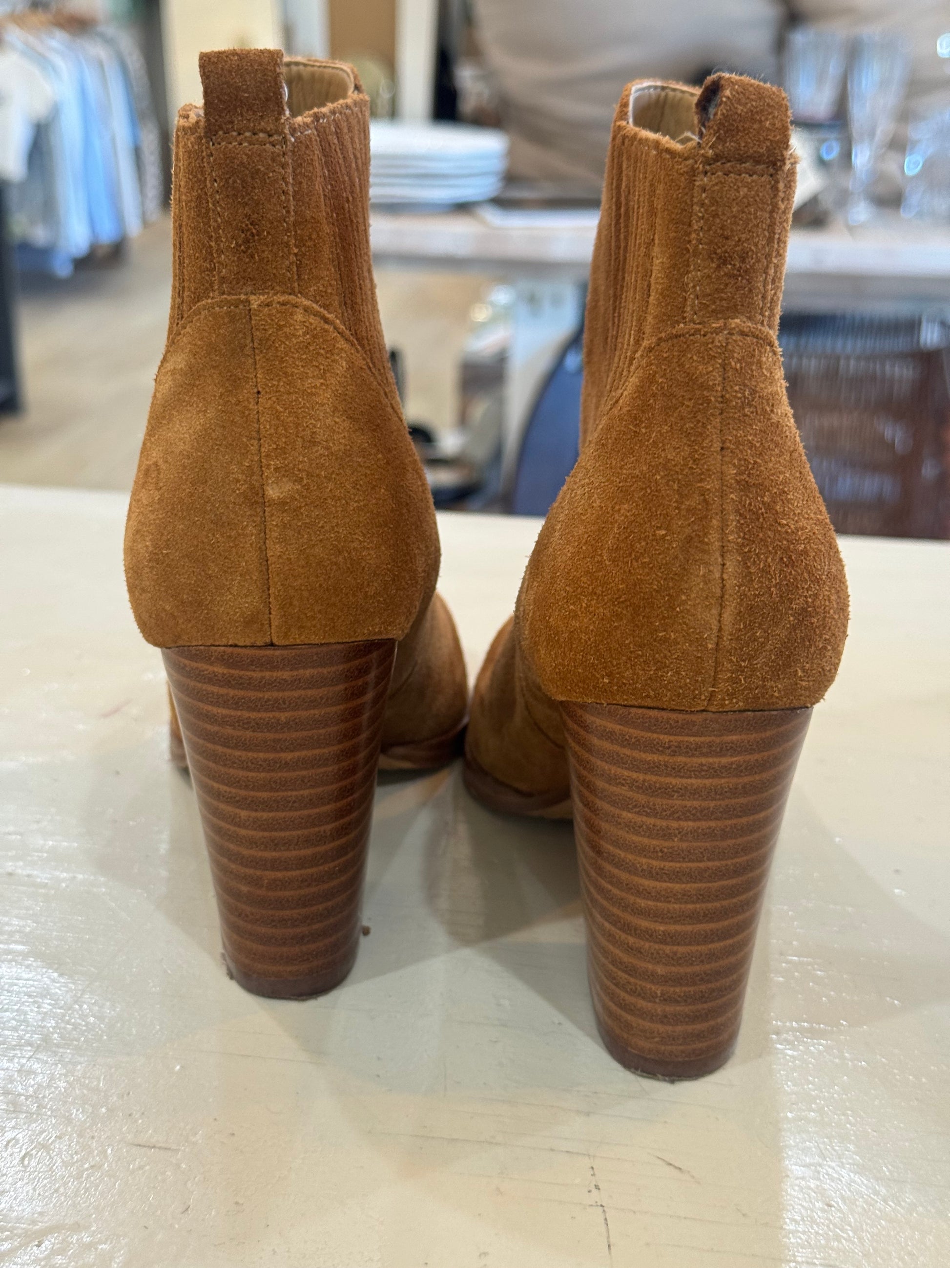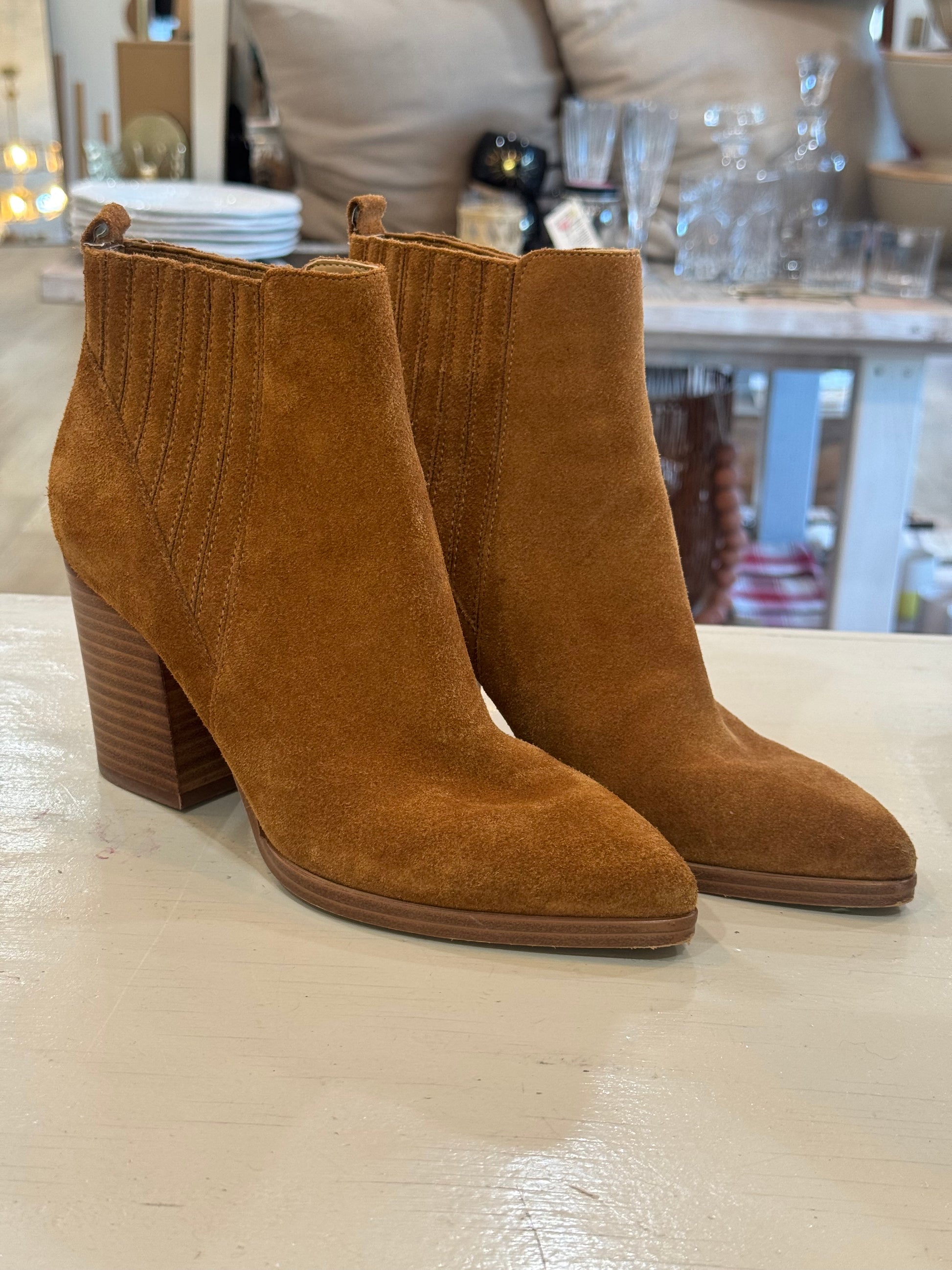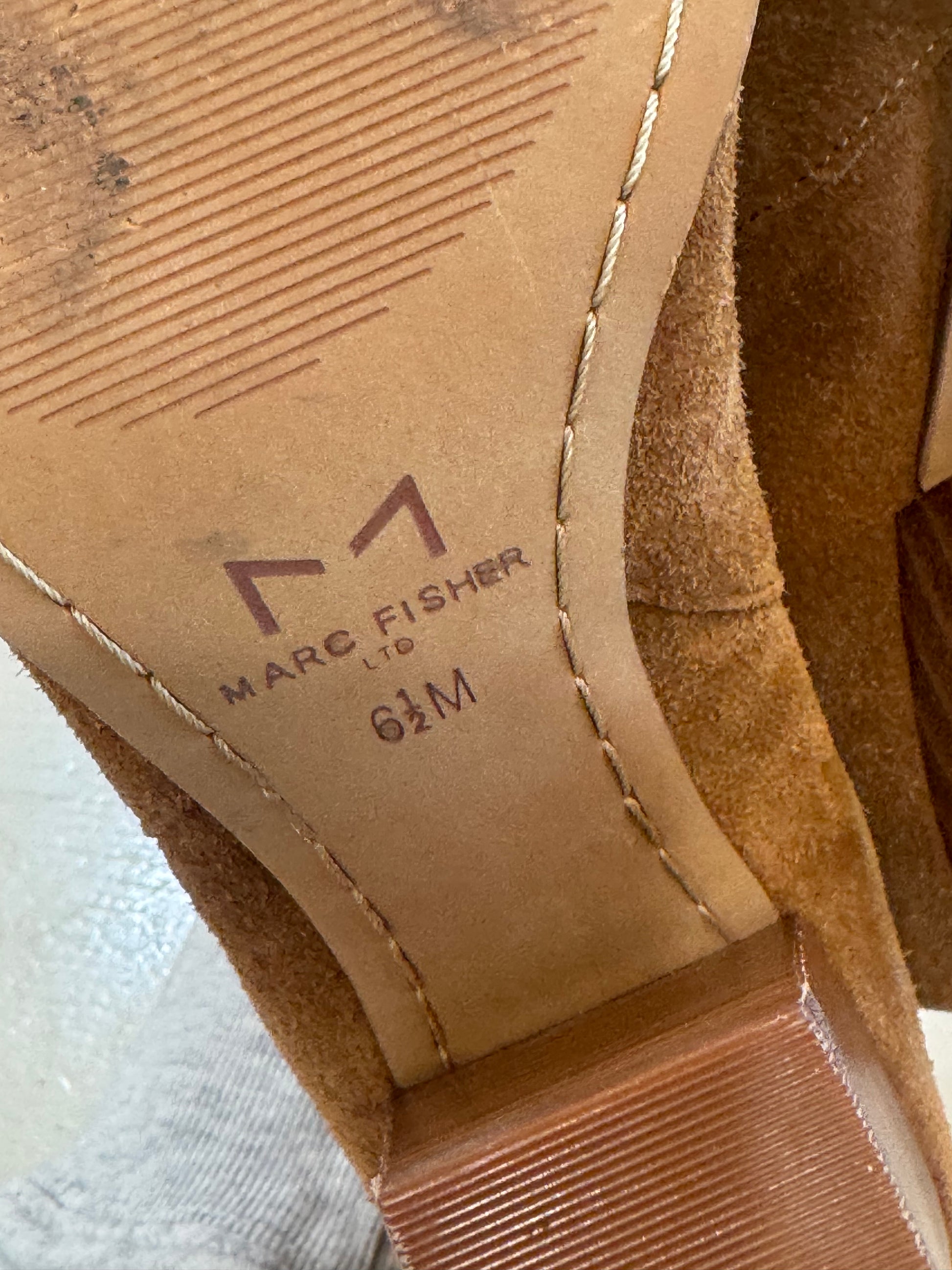 Elevate your everyday style with these timeless Marc Fisher LTD suede ankle booties. Crafted in a rich caramel suede, they feature a classic pointed toe, elastic side panels for easy on-and-off, and a stacked block heel that adds both height and comfort. Subtle wear on the sole and a small scuff on one heel (as shown) – still a gorgeous, high-quality pair for your wardrobe.