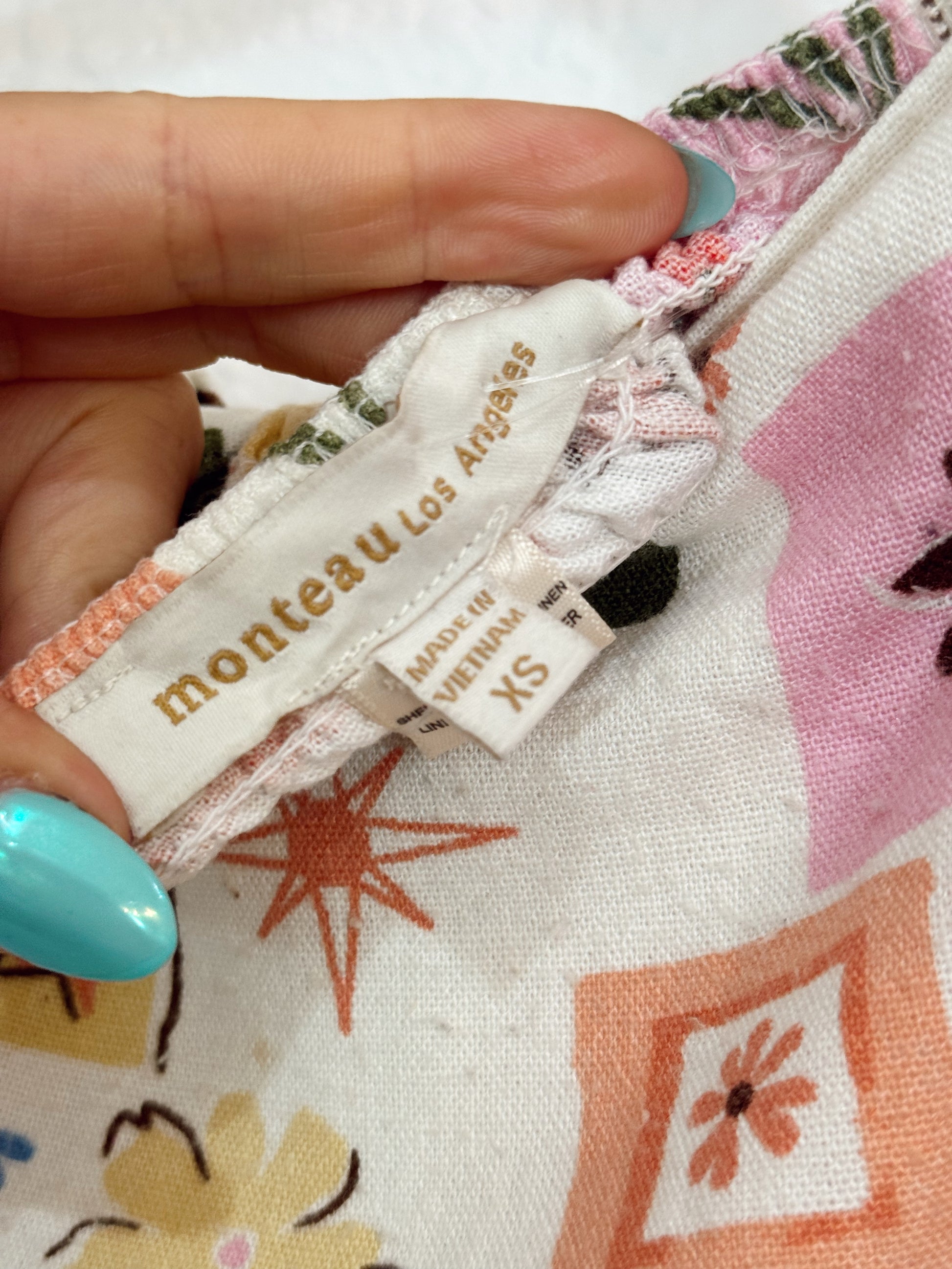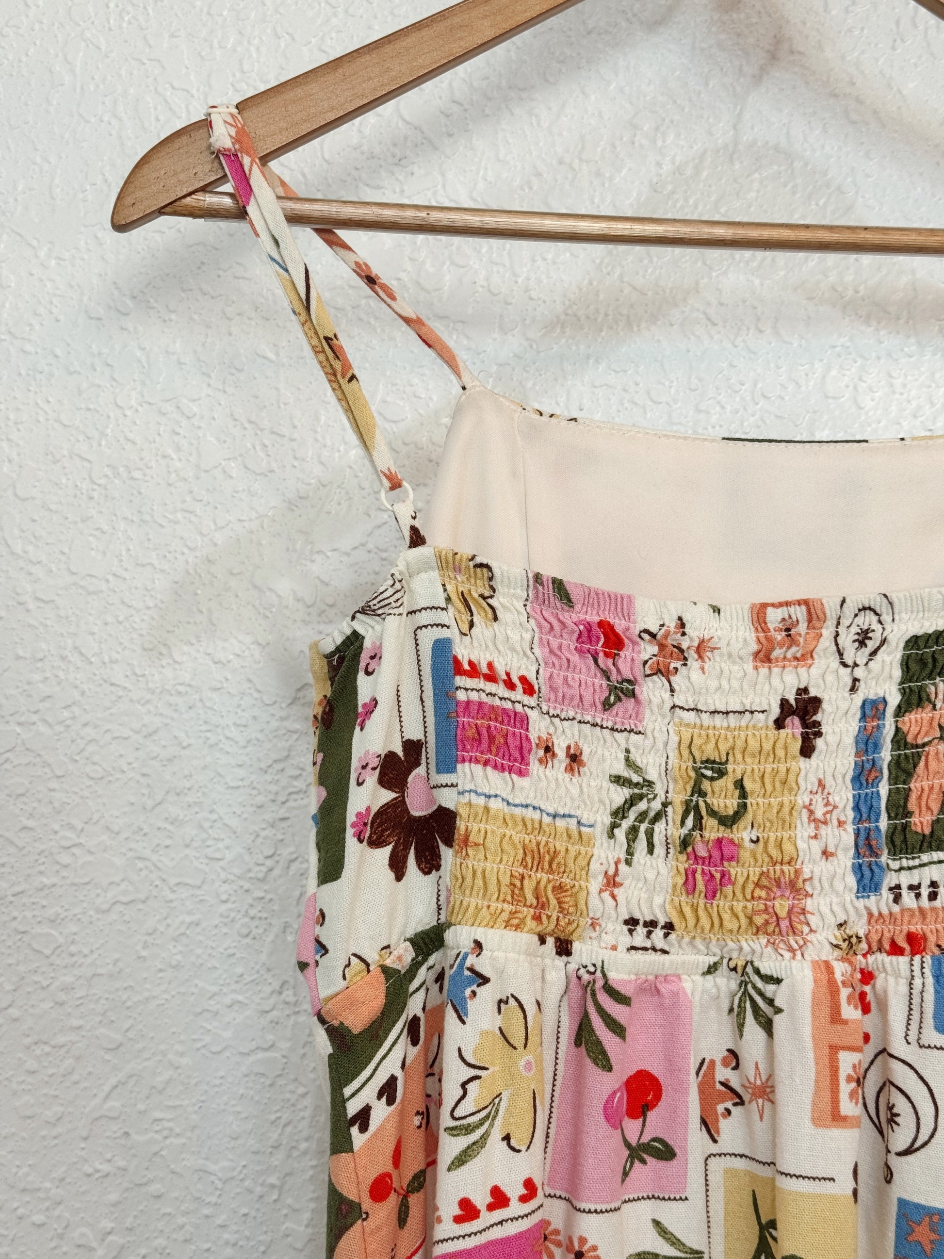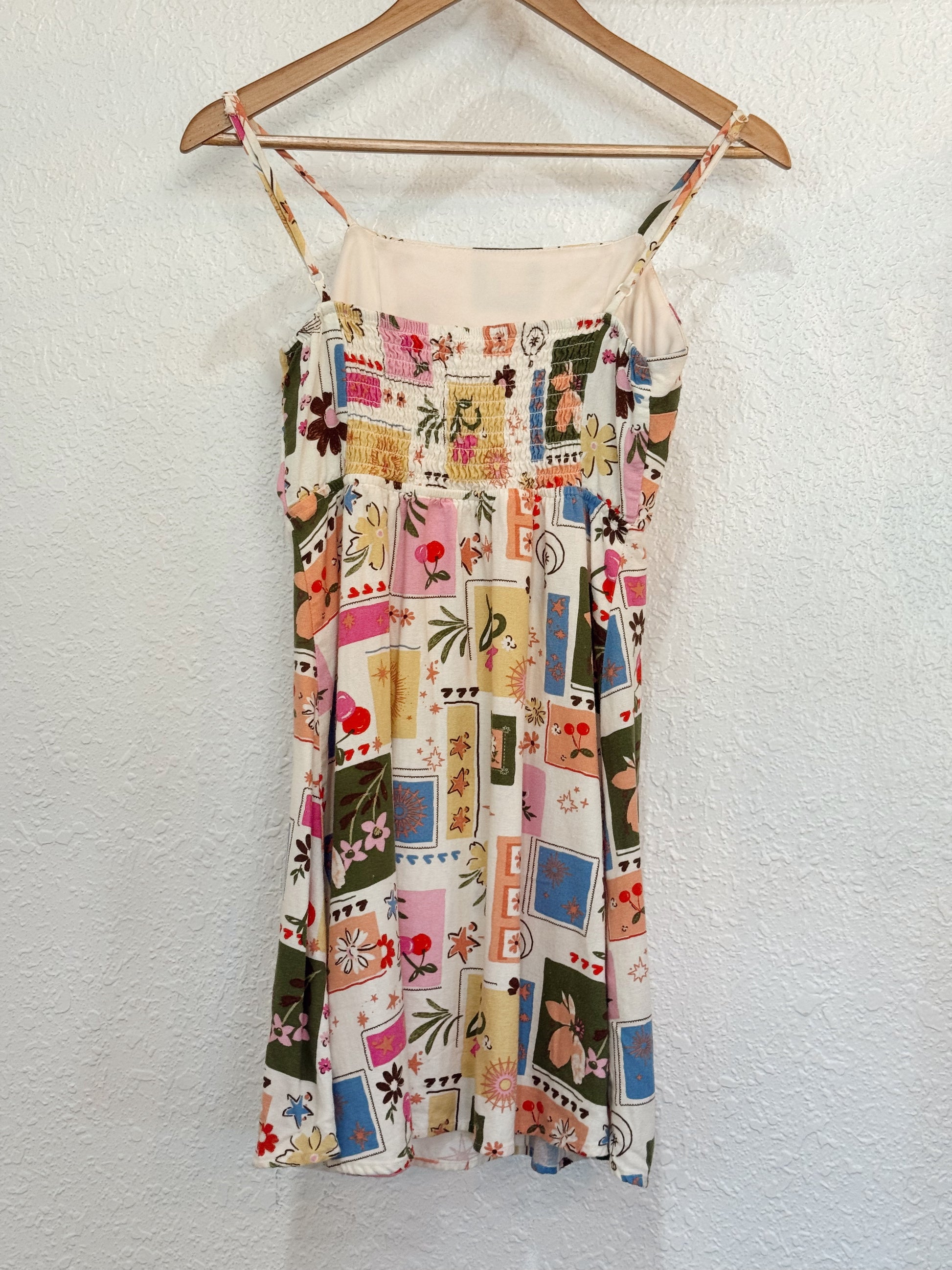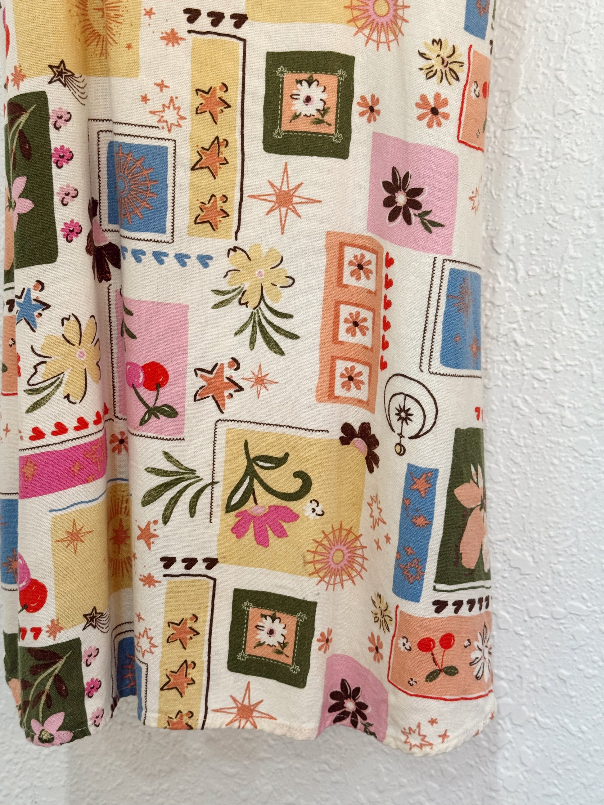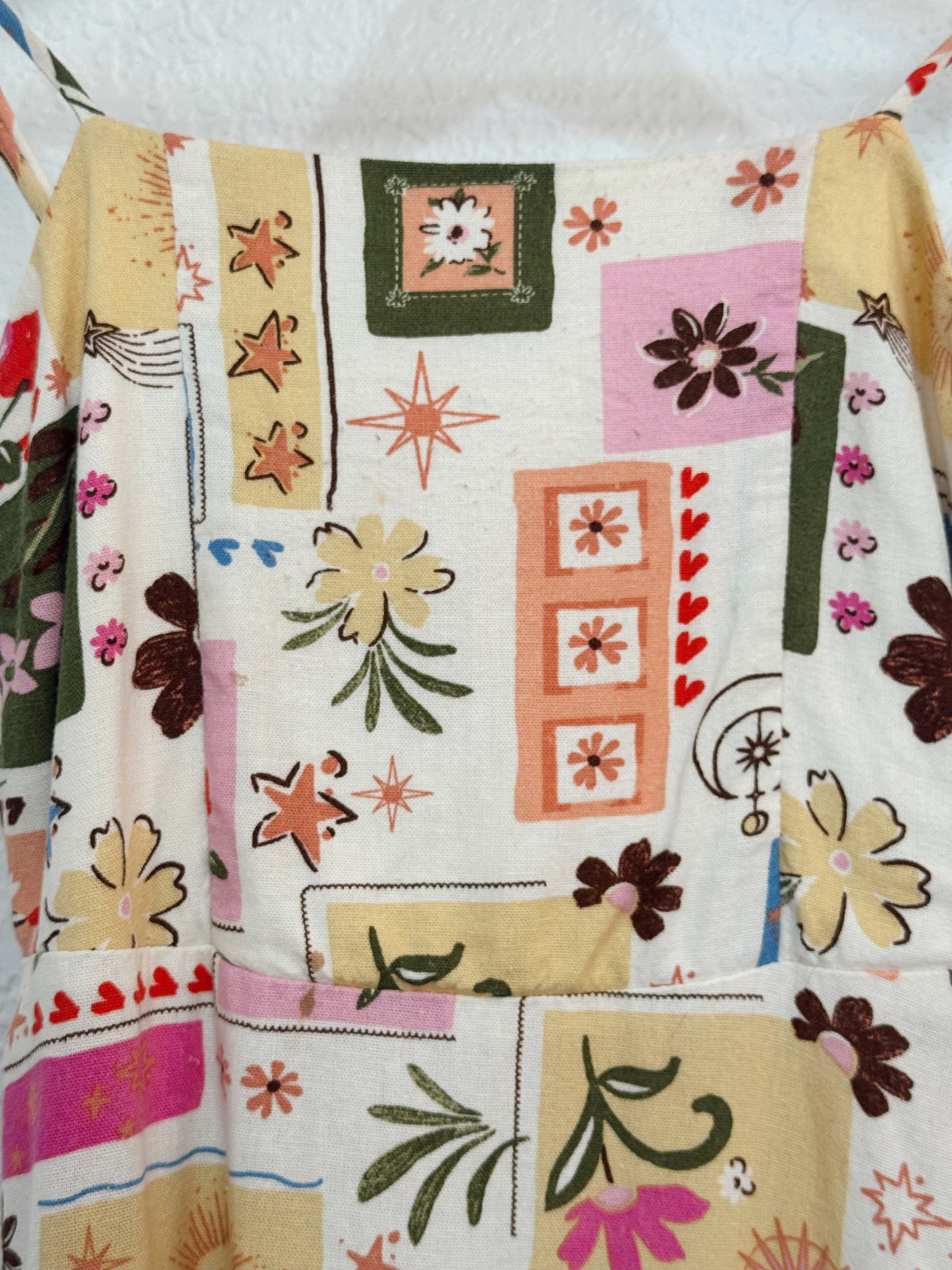 This playful Monteau Los Angeles sundress features a vibrant patchwork print with whimsical florals, stars, and hearts in retro-inspired tones of mustard, pink, olive, and cherry red. Designed with a soft smocked back for a comfy fit and adjustable spaghetti straps, this breezy mini is perfect for sunny days, market strolls, or spontaneous road trips. Lightweight and unlined.