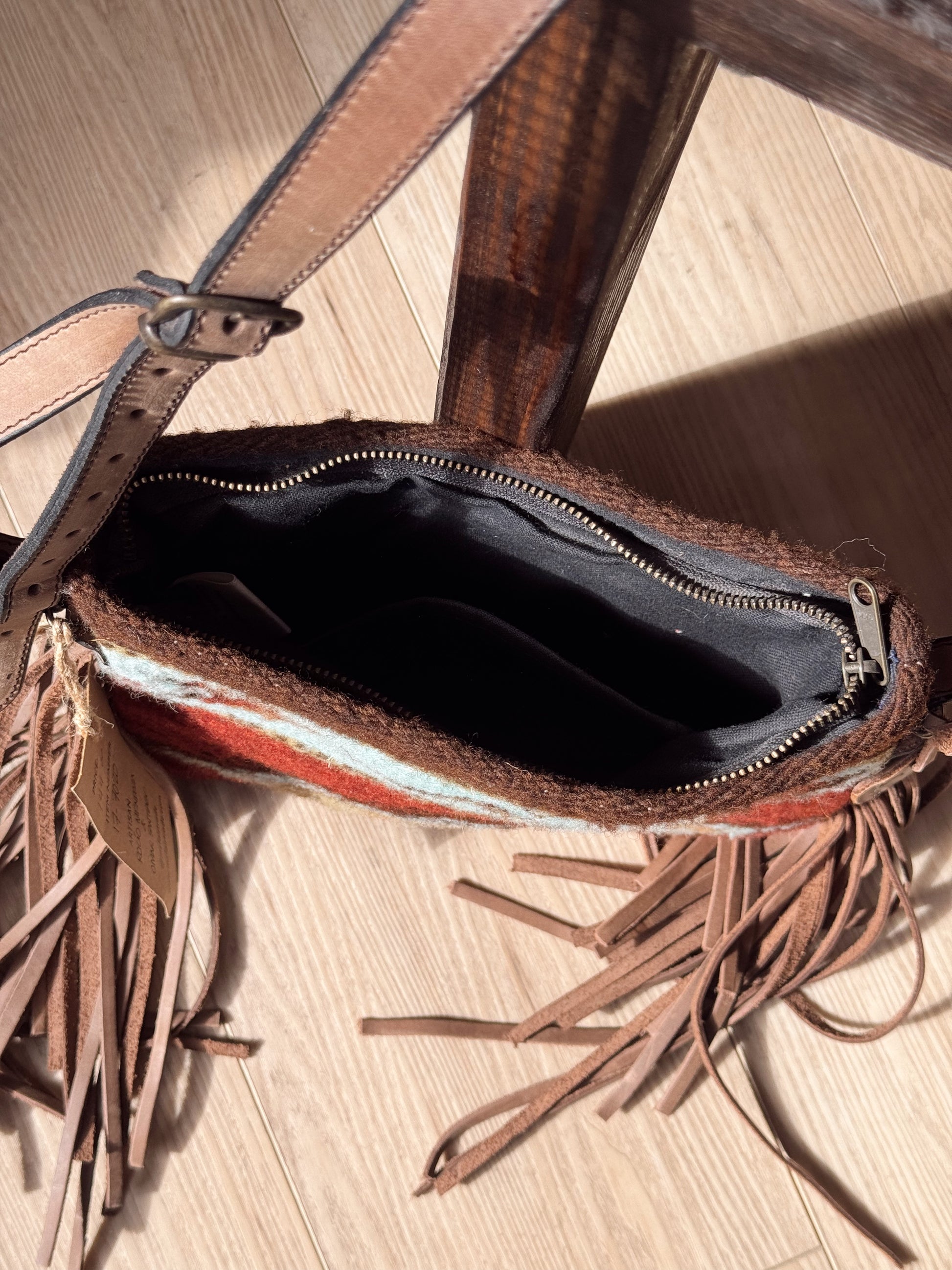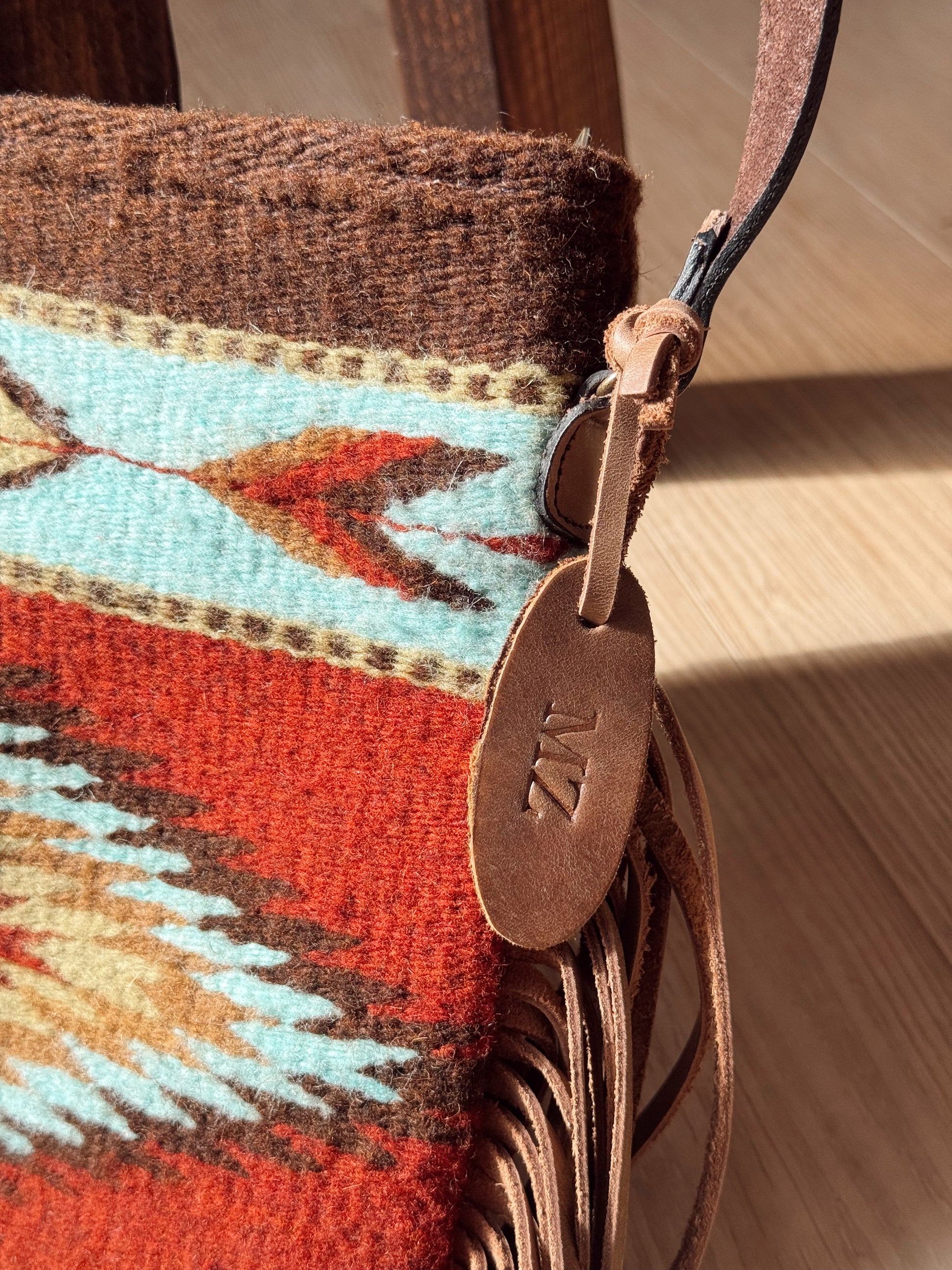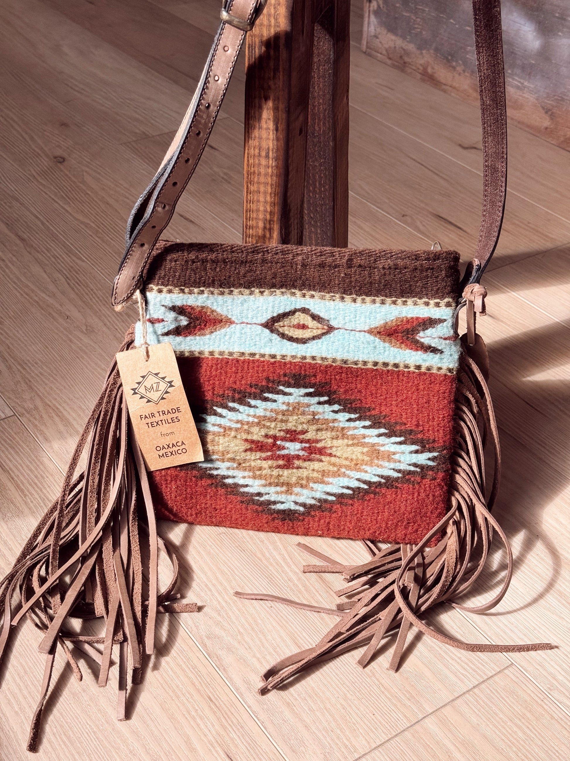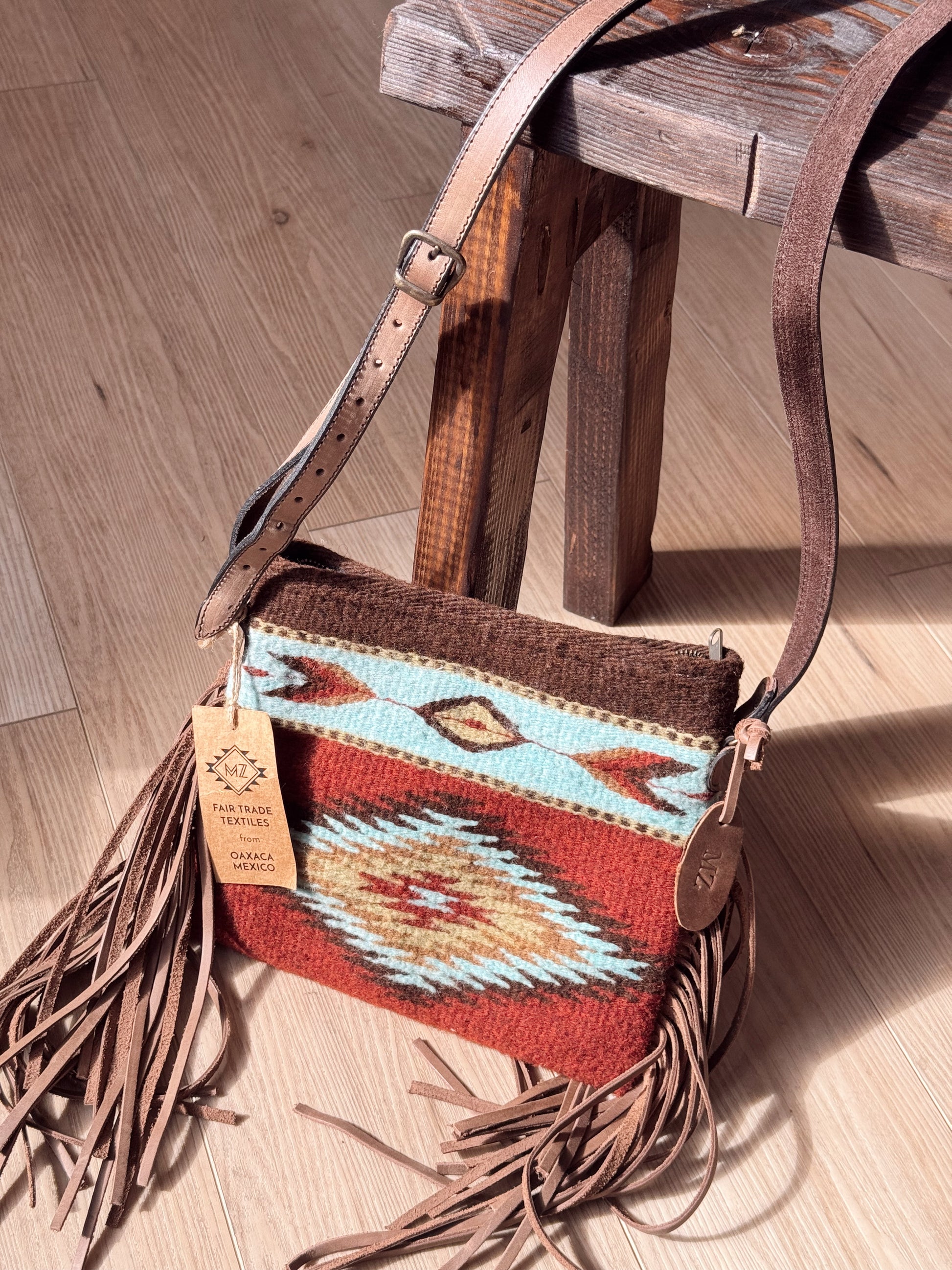 This handcrafted fringe crossbody bag showcases the vibrant Coloration pattern, woven with traditional Zapotec diamond and arrow motifs in rich turquoise and brick red. The bold palette is complemented by luxurious suede fringe and an adjustable genuine leather strap, creating a standout piece that blends culture, craft, and function.