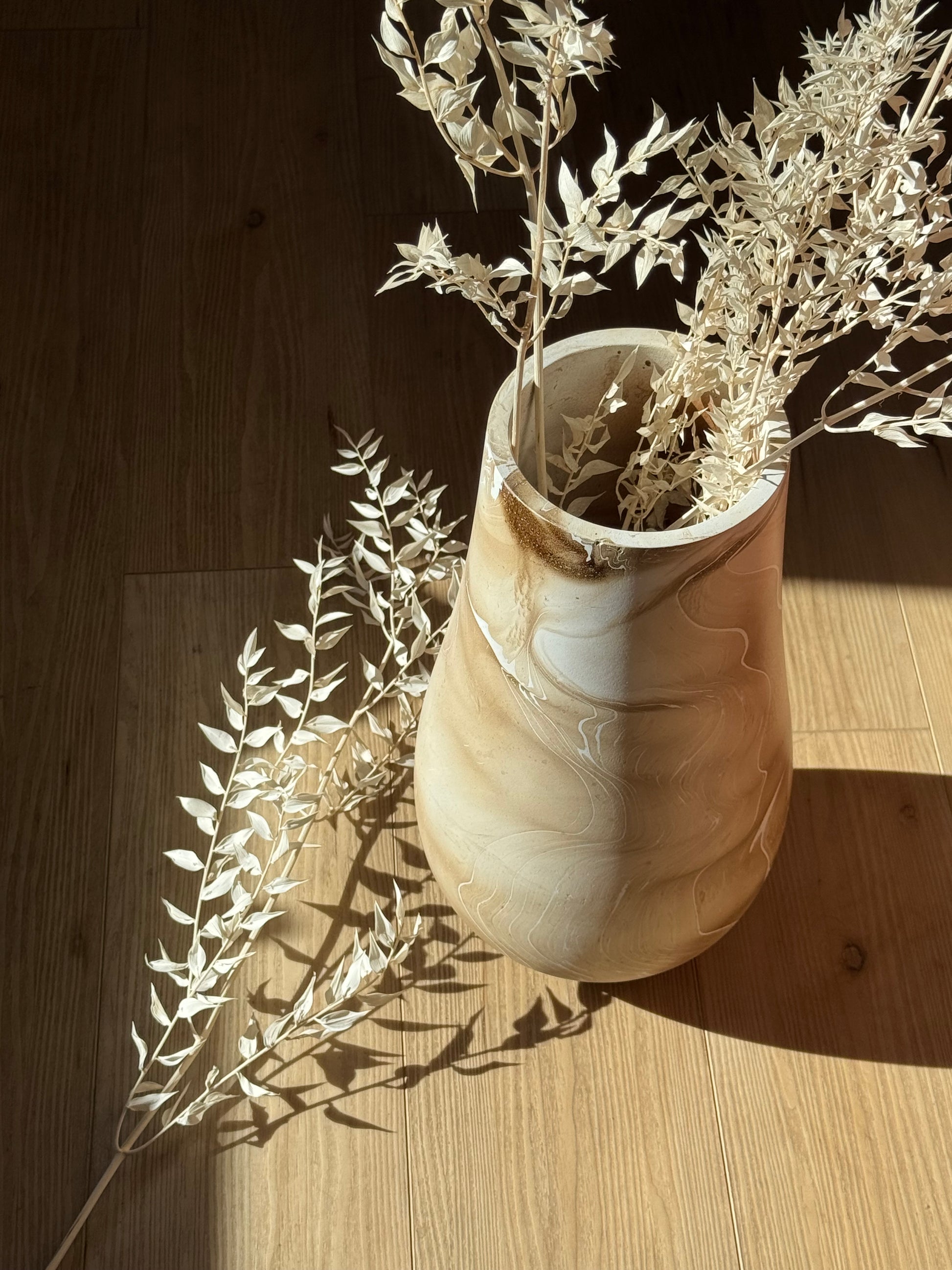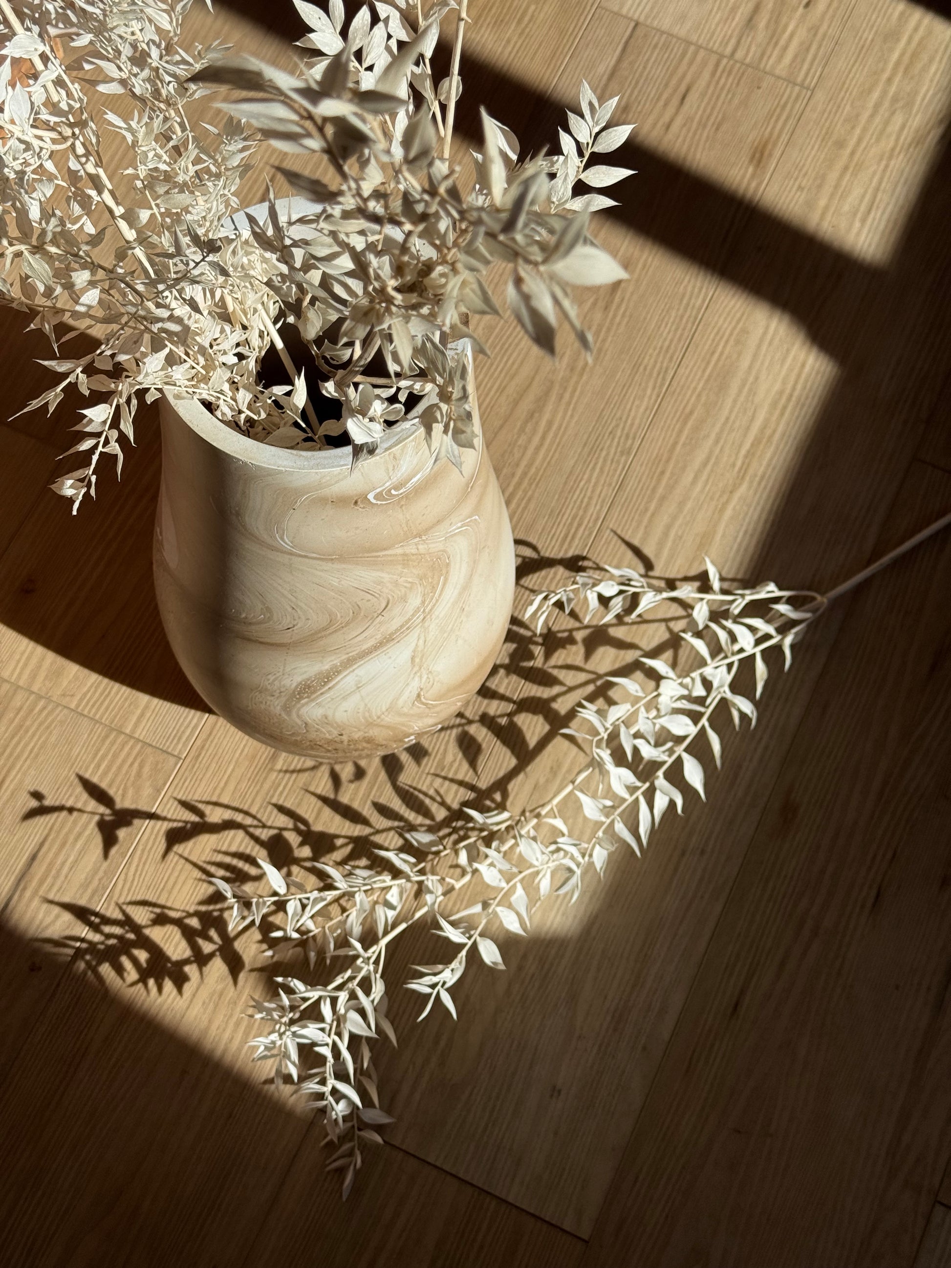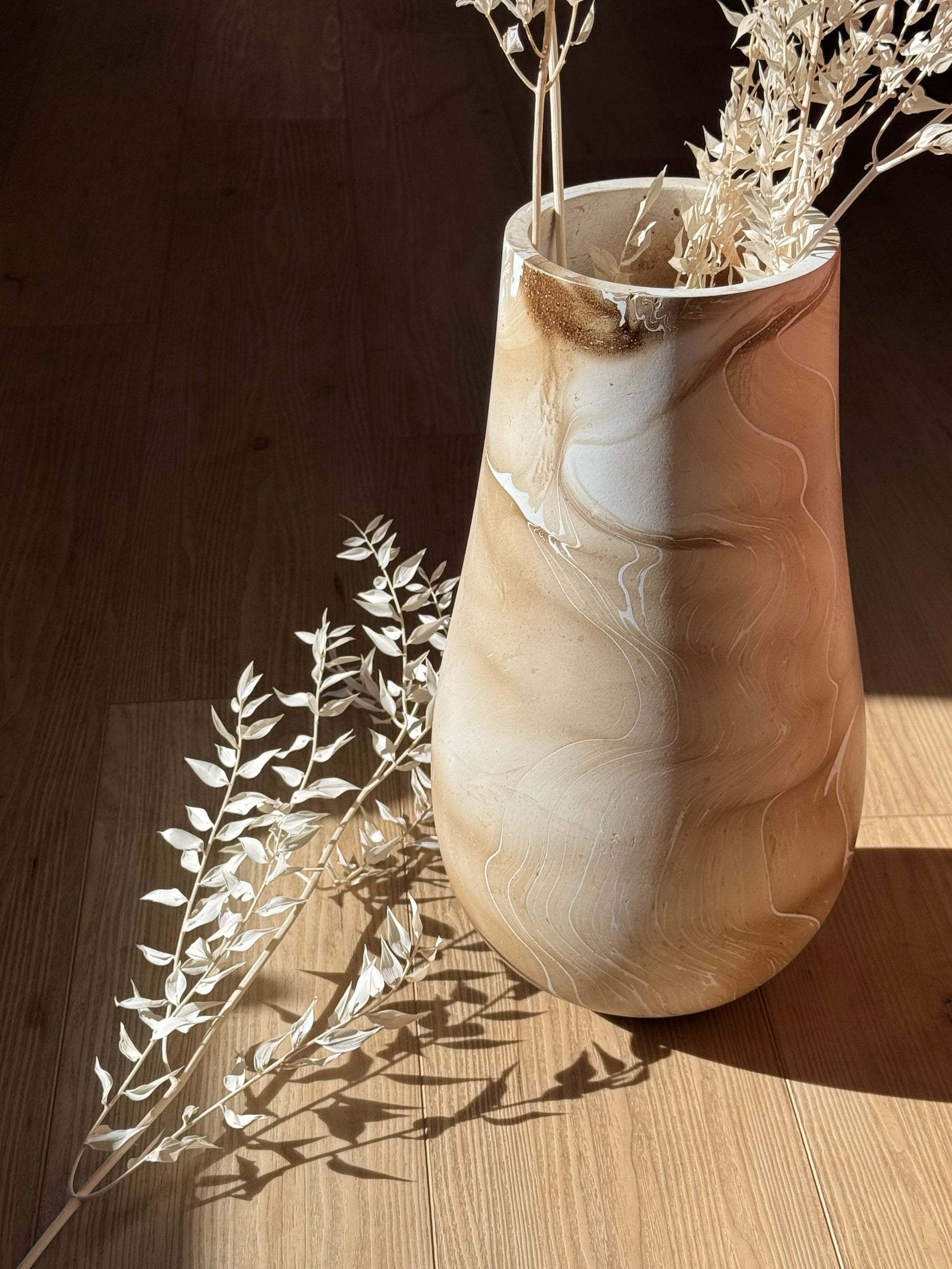 Crafted from sustainably sourced mango wood, this large marbled vase features warm latte tones and organic swirling patterns that make each piece one-of-a-kind. Its smooth, sculptural silhouette is perfect for showcasing pampas grass, dried botanicals, or simply as a statement decor piece on its own.