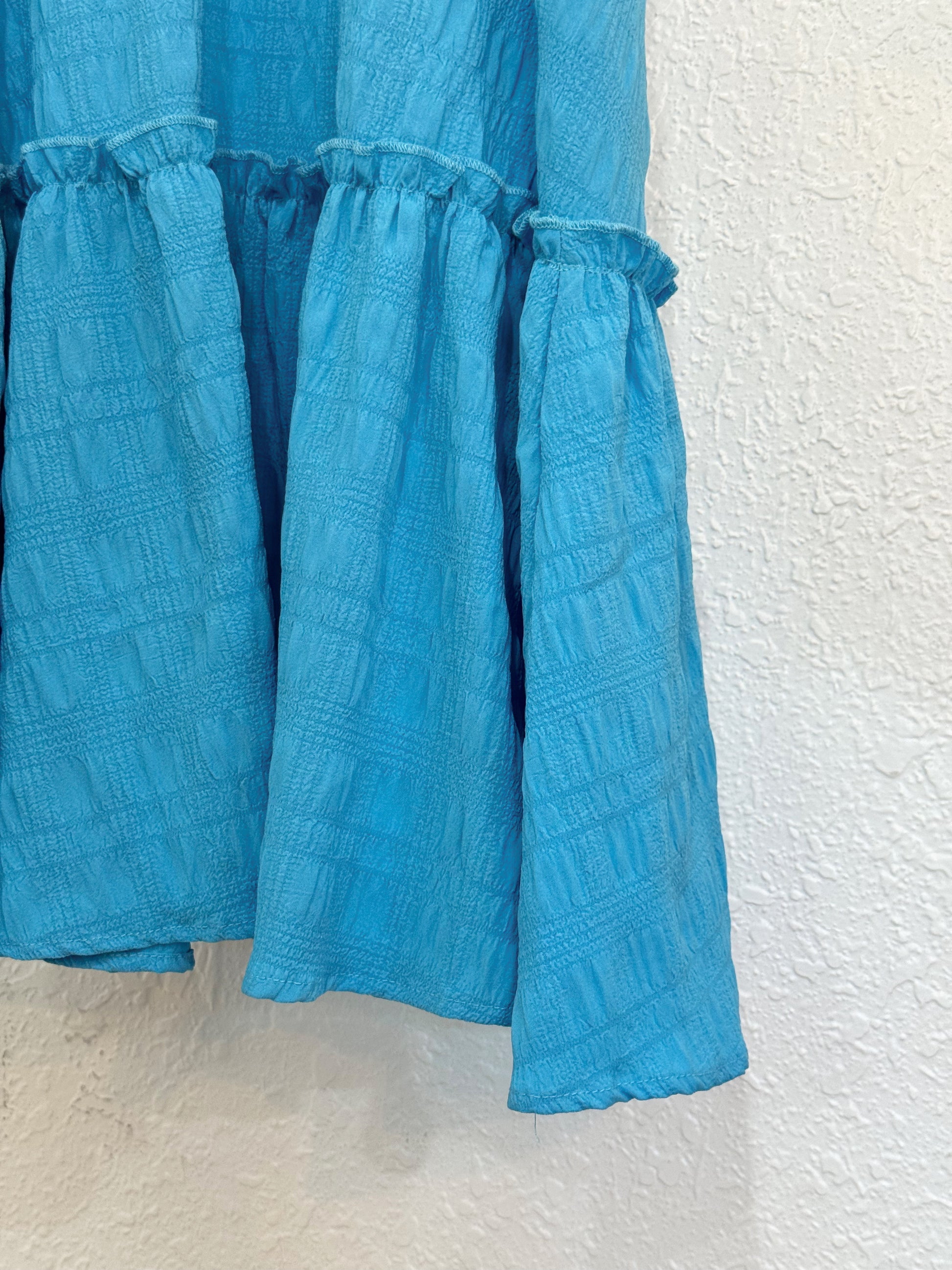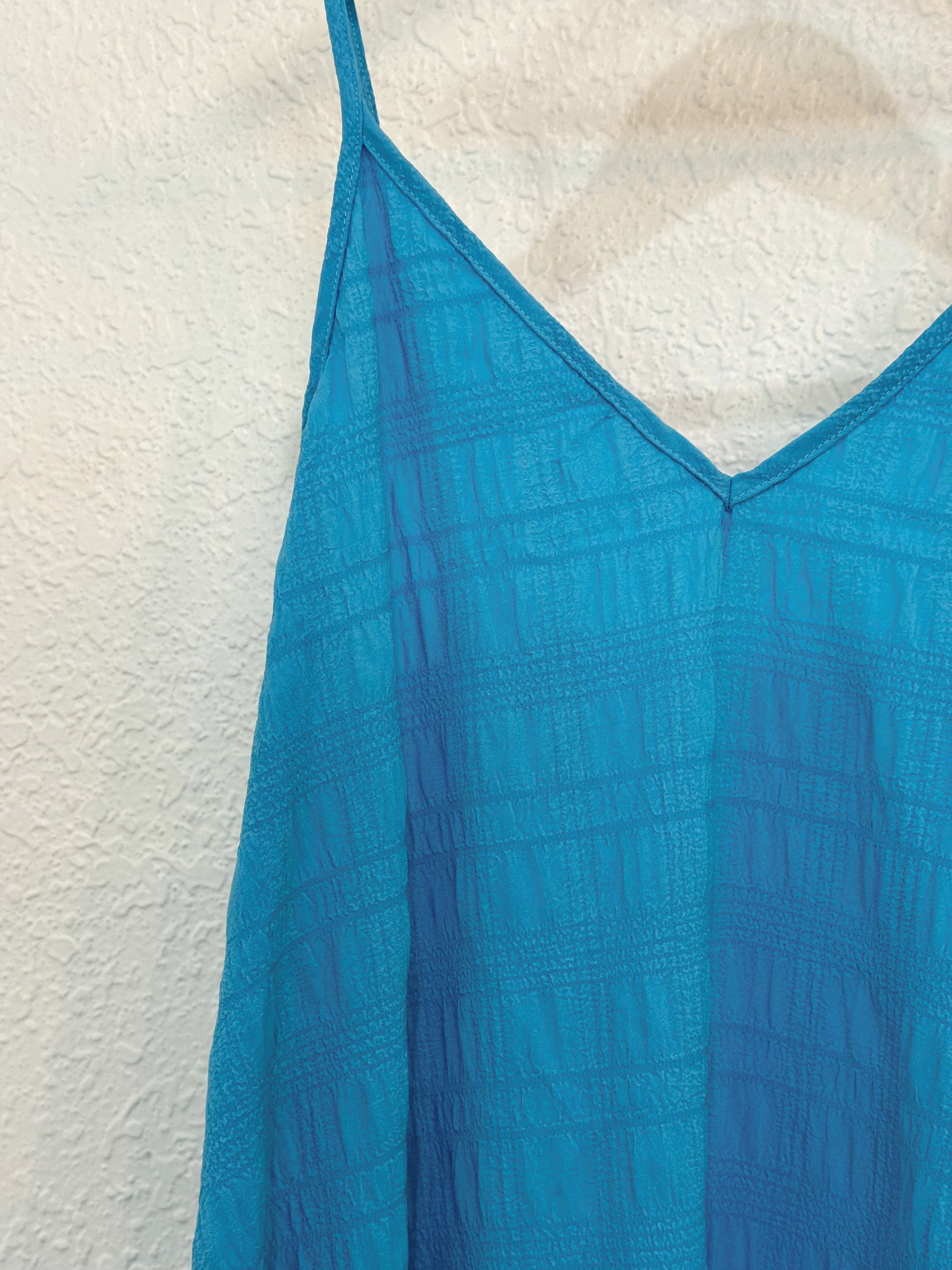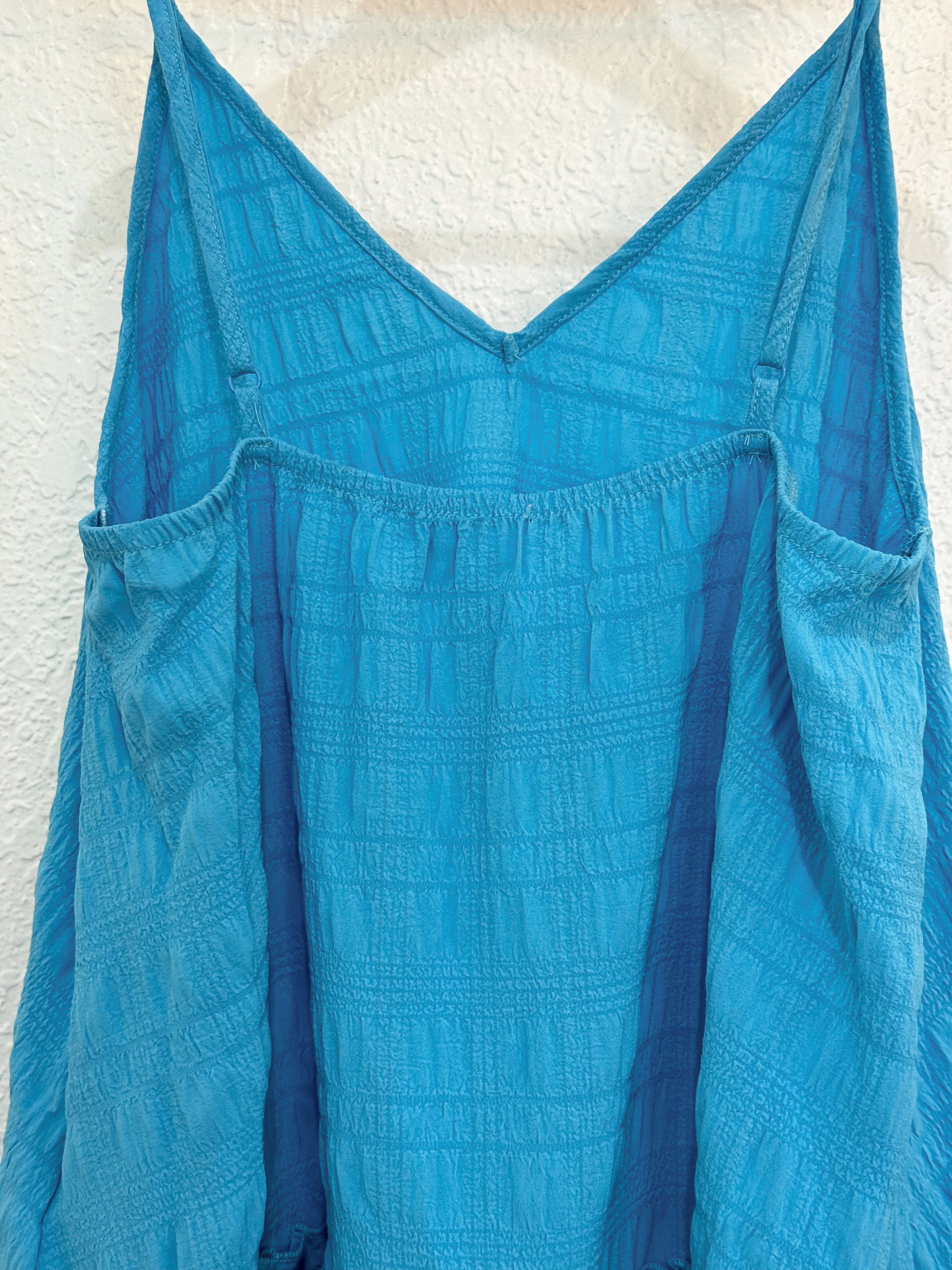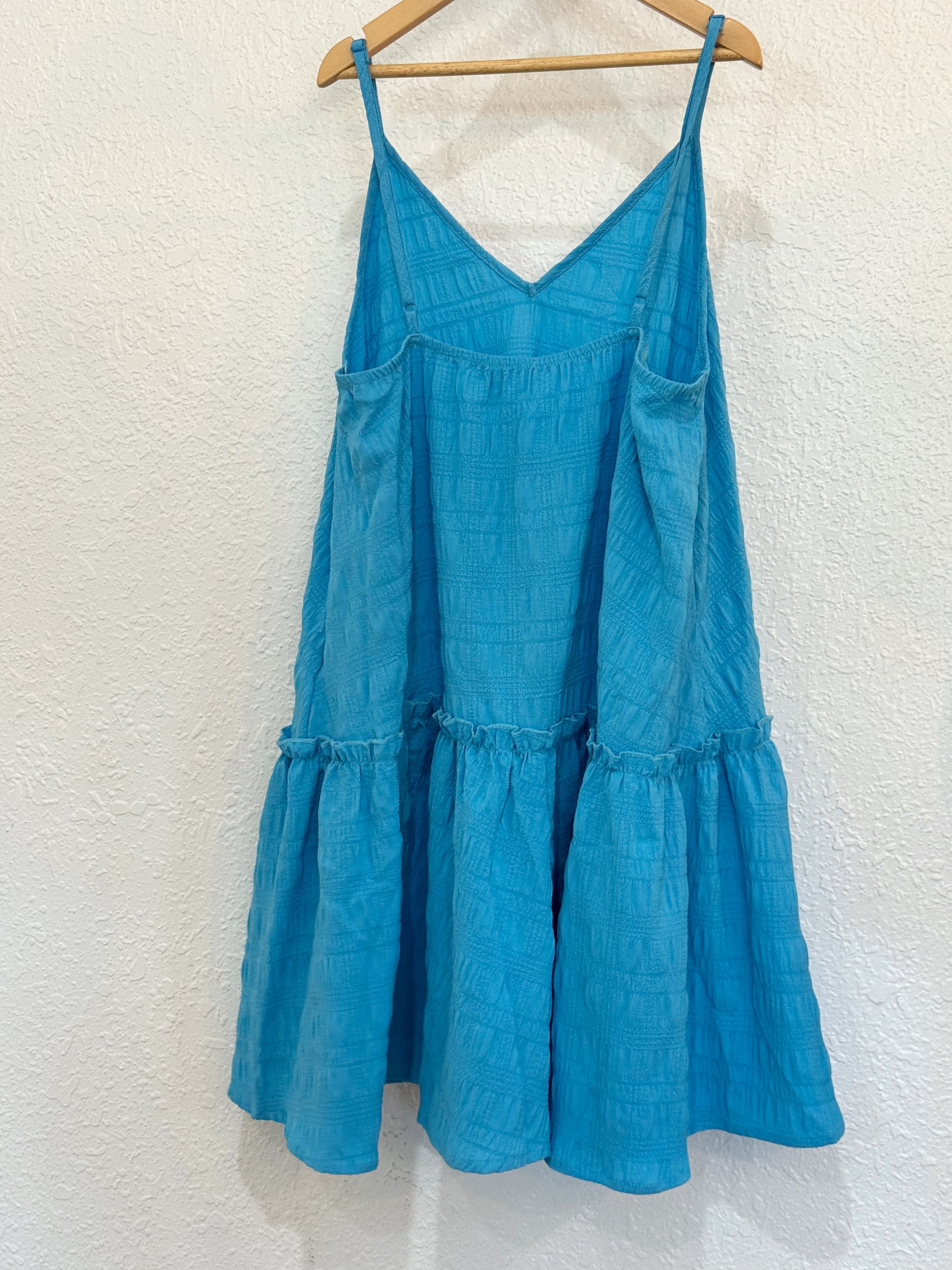Make waves in this vibrant ocean-blue mini dress featuring a lightweight textured fabric and flouncy tiered hem. Adjustable spaghetti straps and a relaxed fit make it perfect for sunny days, beach strolls, or layering with your favorite jacket. Flattering on a range of body types — this one-size beauty is breezy, bold, and effortless.