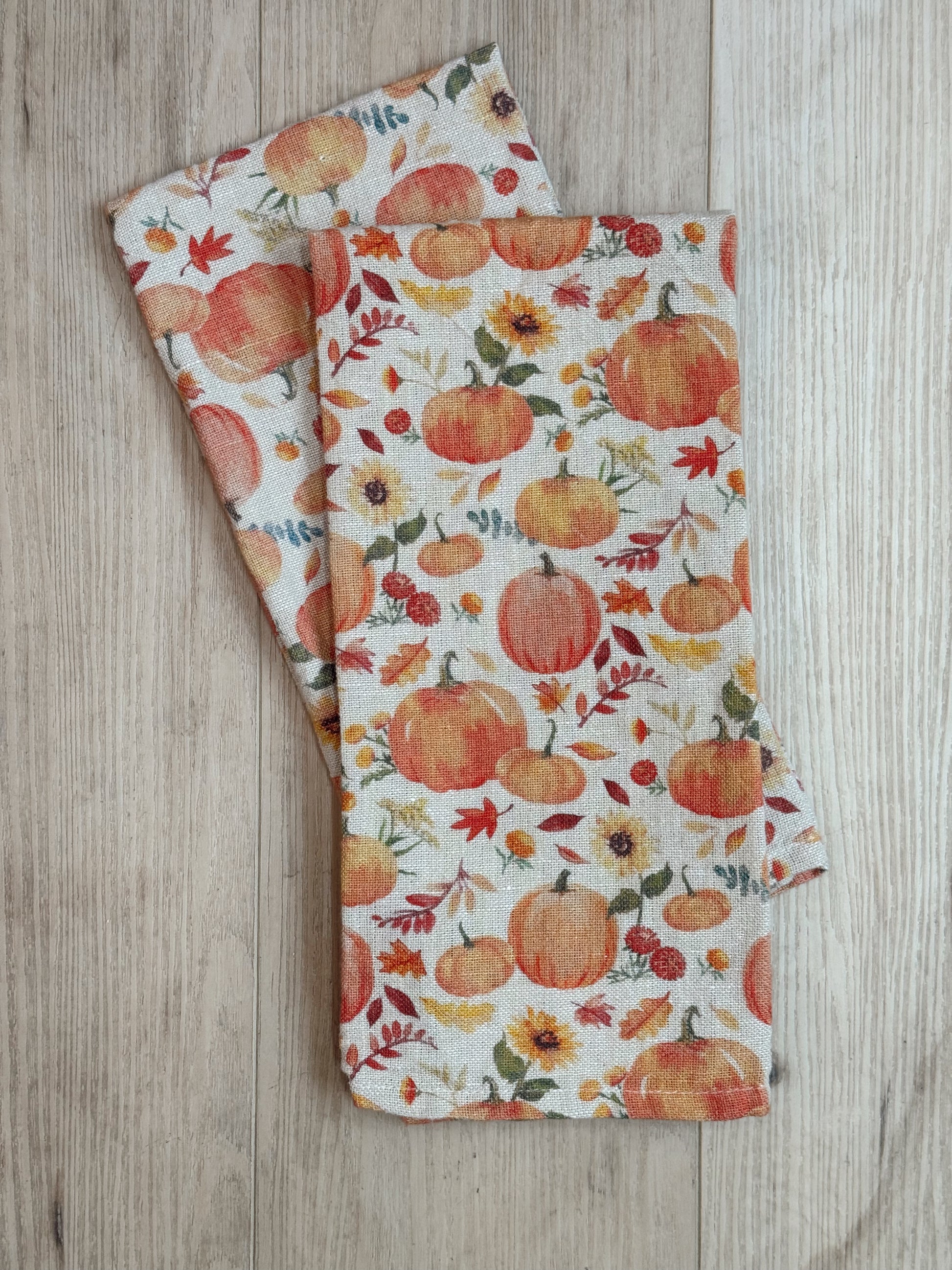 this charming pumpkin patch tea towel. Adorned with plump orange pumpkins, golden sunflowers, berries, and colorful autumn leaves, it captures the cozy spirit of fall. Crafted from a 60% cotton / 40% linen blend, it’s soft, durable, and perfect for drying dishes or adding seasonal style to your space.