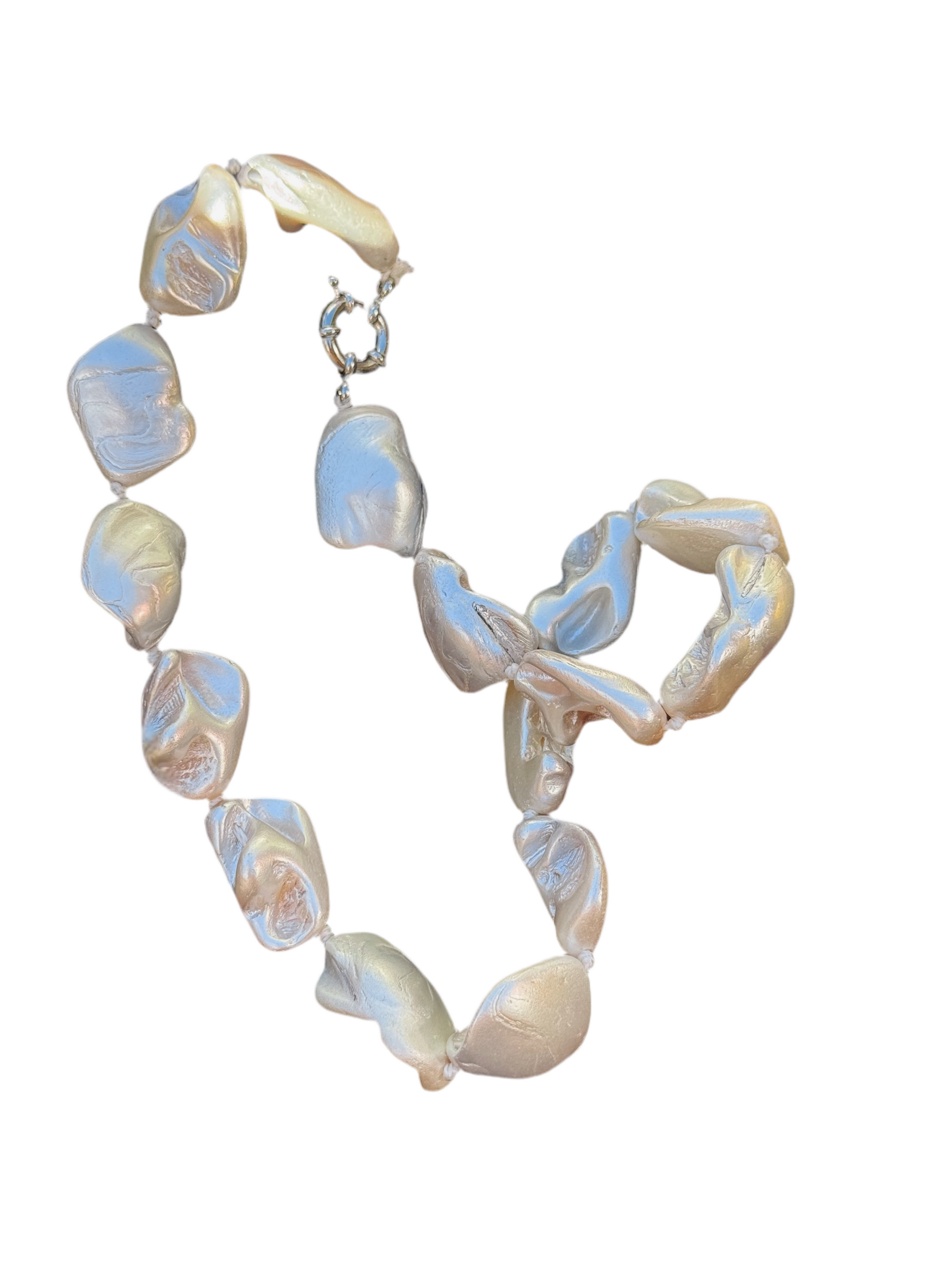 Elevate your look with this stunning pearlescent shell necklace — featuring chunky, organically shaped beads that mimic the glow of natural pearls with a sculptural twist. Lightweight yet bold, this piece brings effortless coastal glam to any outfit. Finished with a secure toggle clasp for easy wear. Perfect for layering or letting it shine on its own.