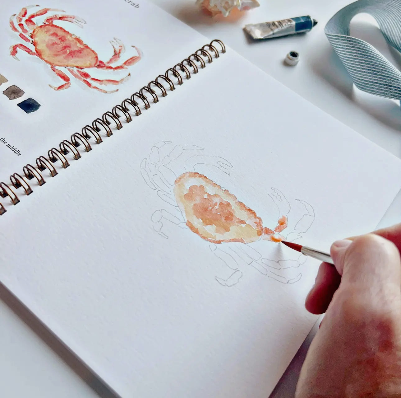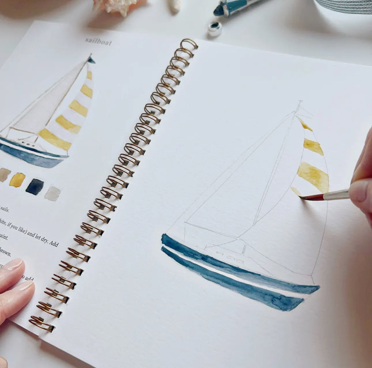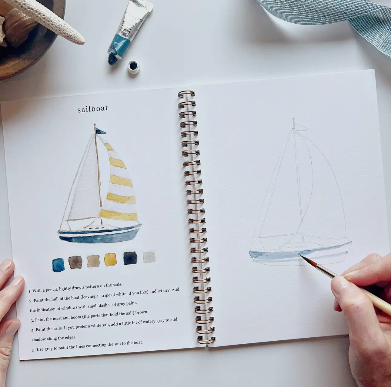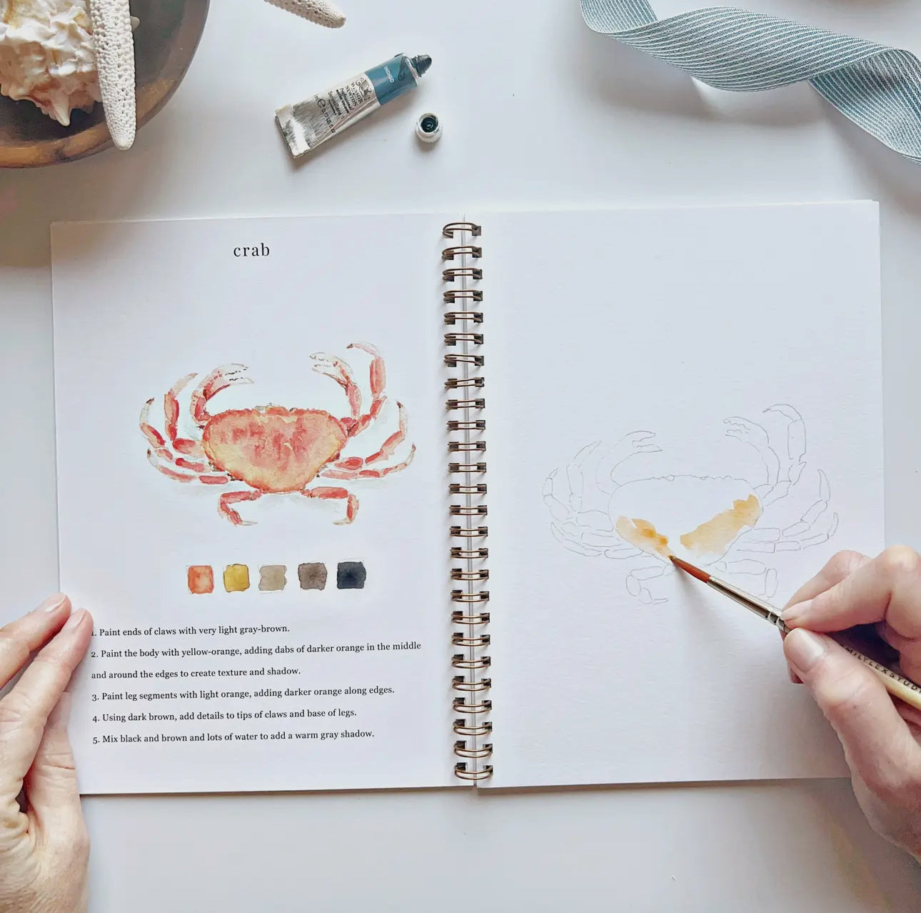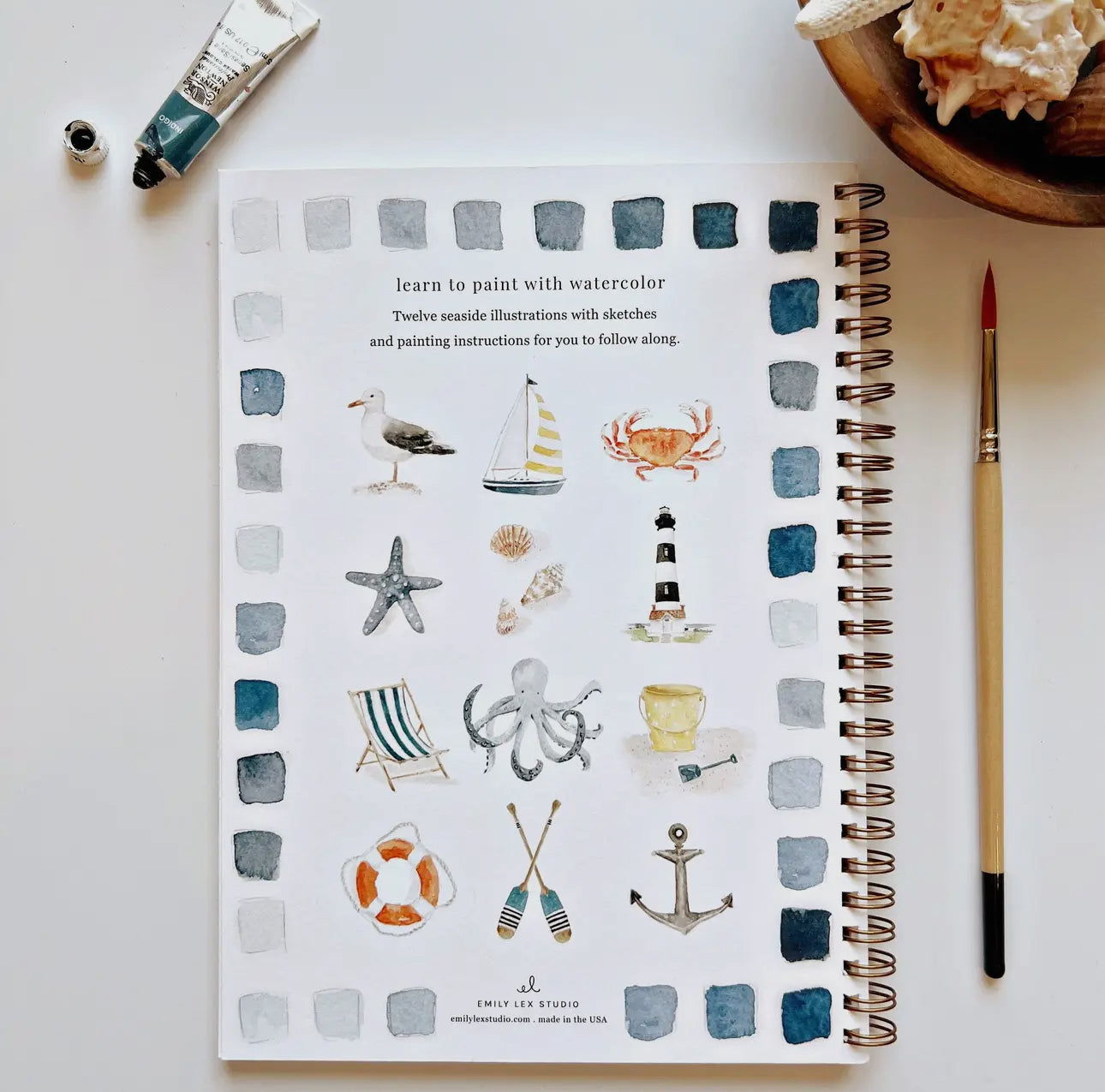Capture the calm of the coast with the Seaside Watercolor Workbook by Emily Lex Studio. This beautifully designed spiral-bound workbook features 12 charming seaside illustrations—including starfish, sailboats, lighthouses, crabs, and more—each with step-by-step watercolor instructions and curated color palettes.