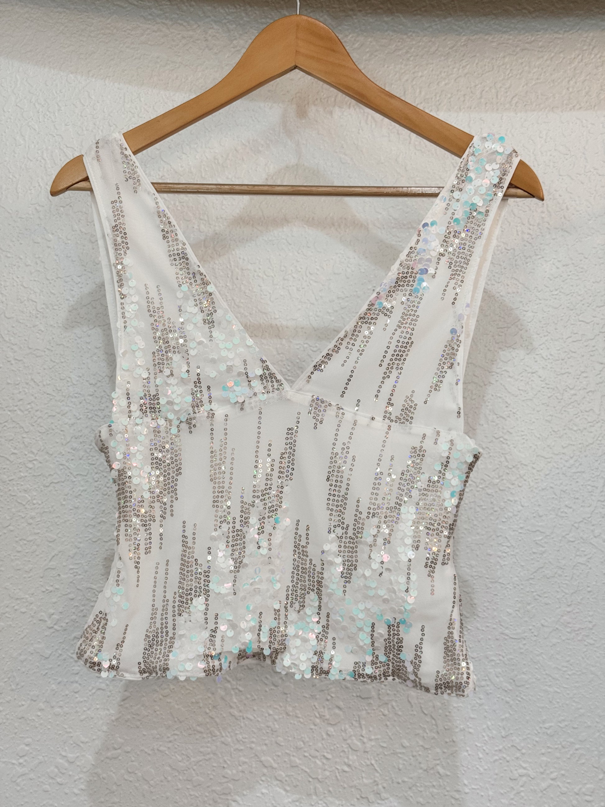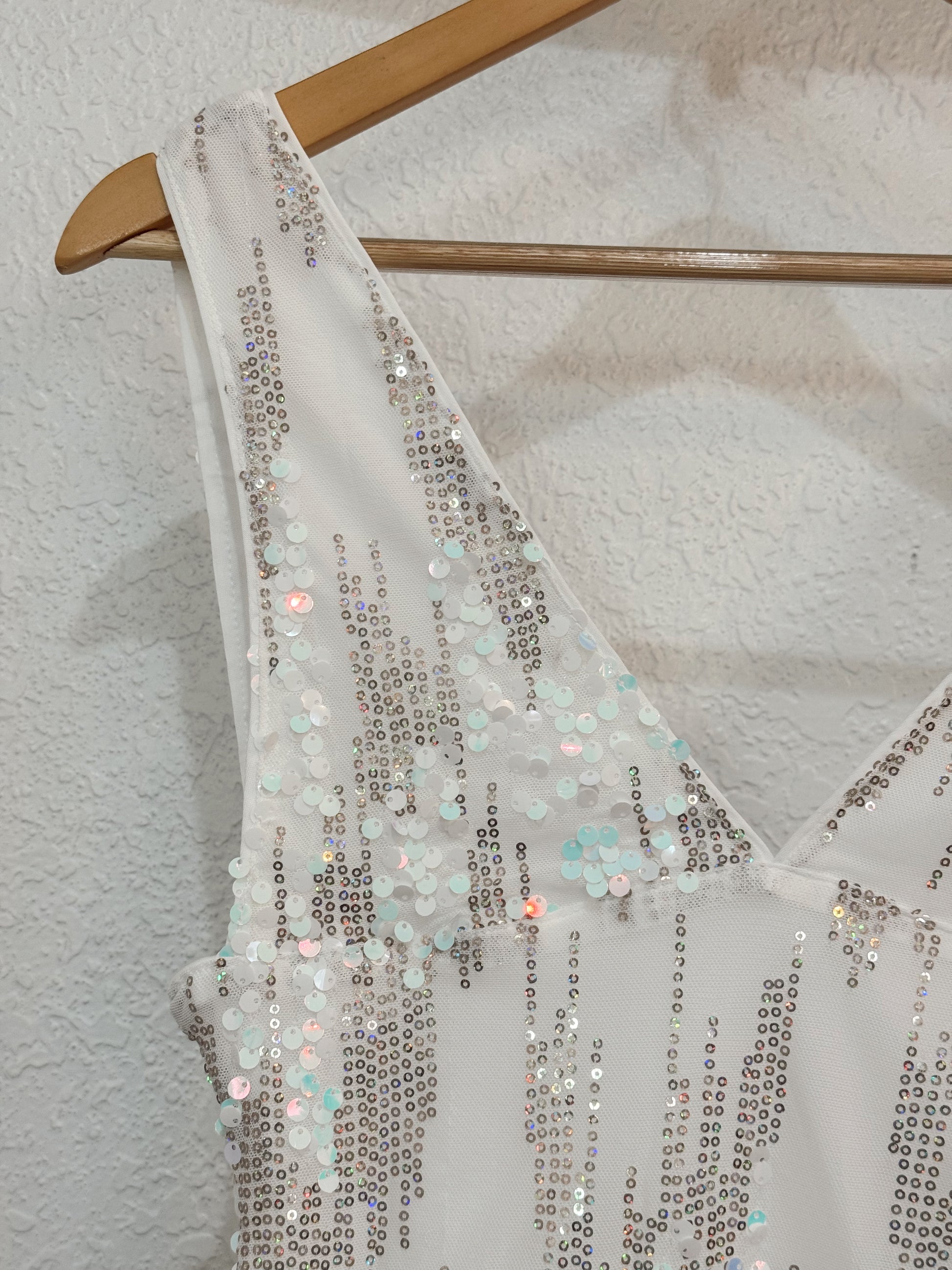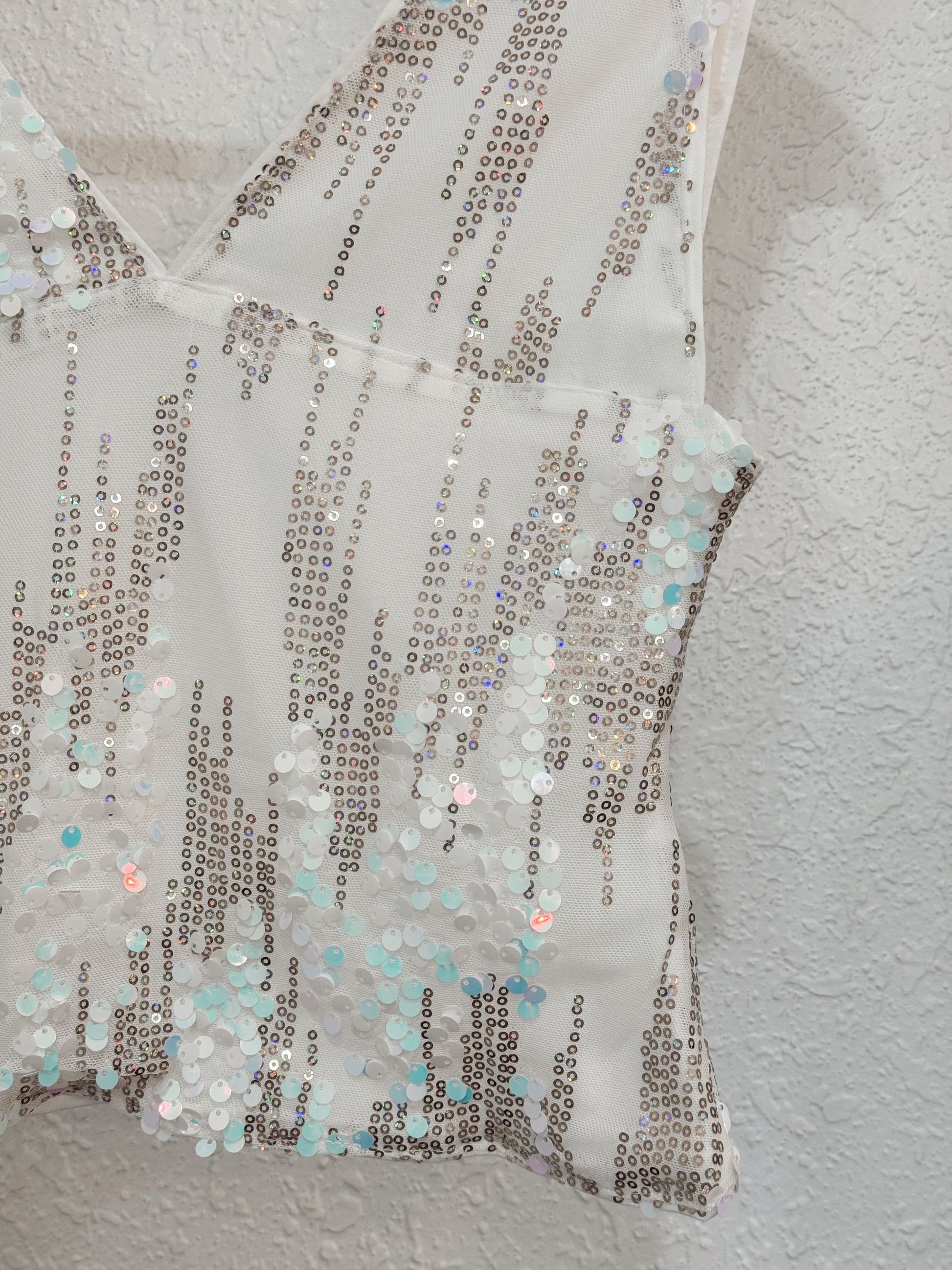 Bring the sparkle in this dazzling white sequin top featuring vertical iridescent detailing and a flattering V-neckline front and back. Perfect for nights out, bachelorette weekends, or layering under a blazer for a glam twist. Stretchy, lightweight, and lined for comfort—this top is made to shine.
