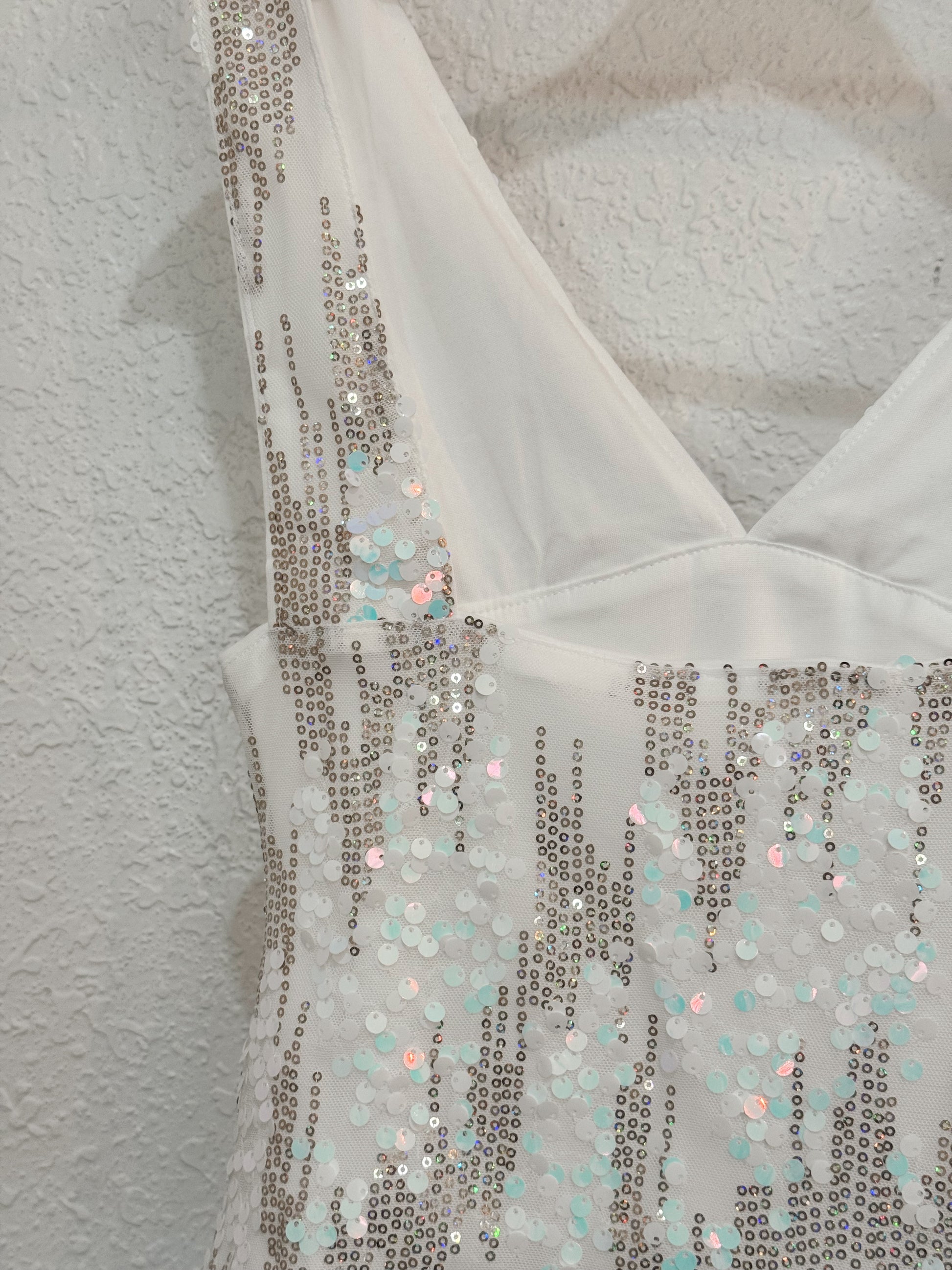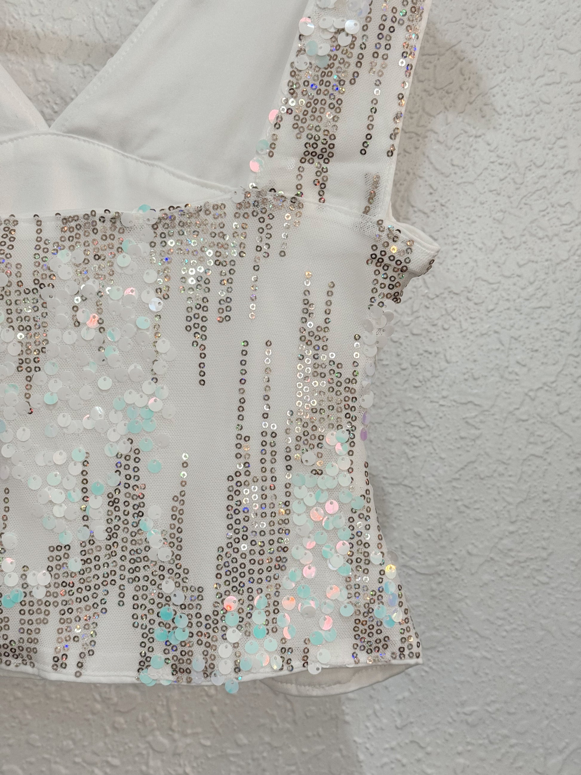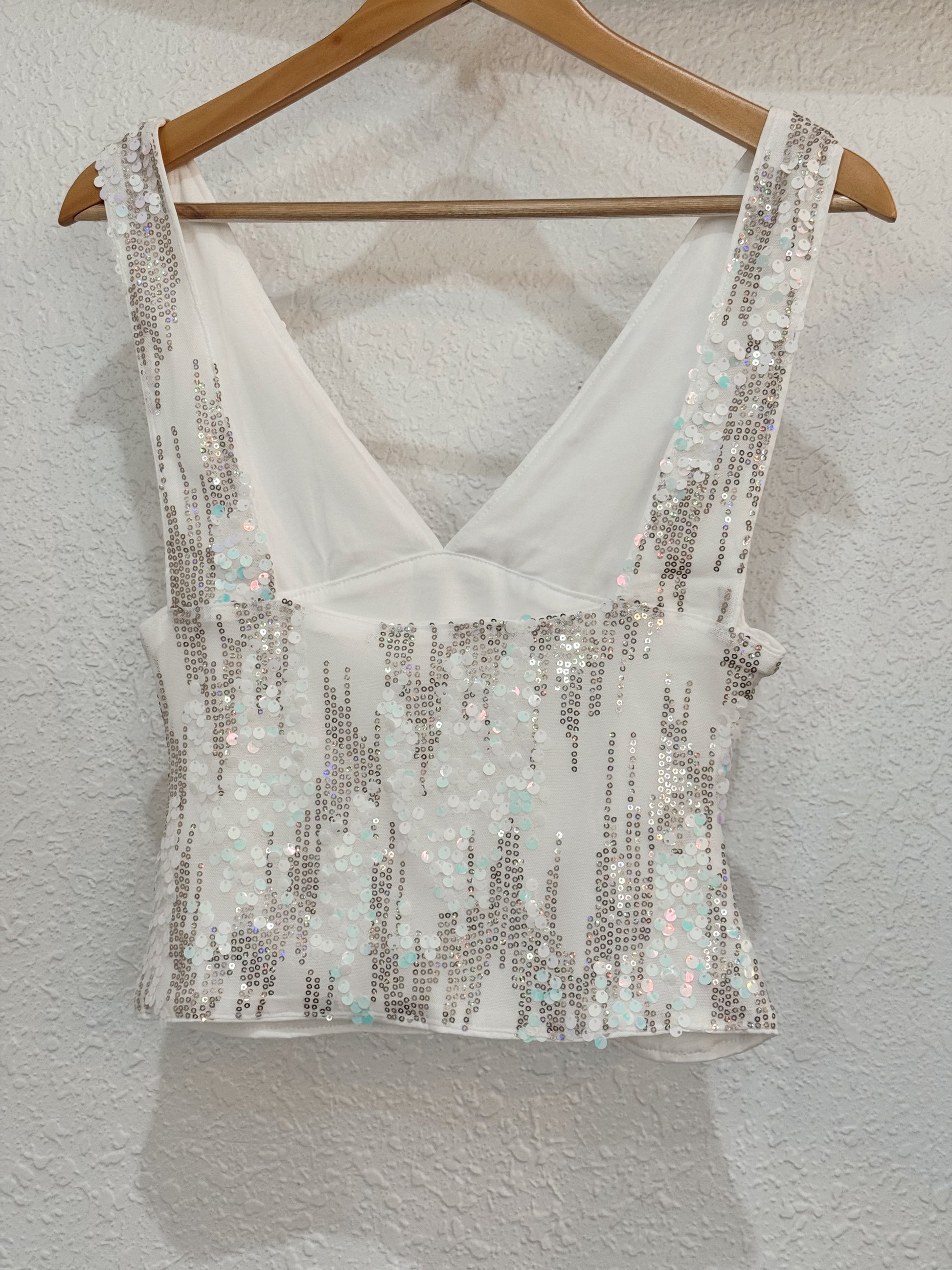 Bring the sparkle in this dazzling white sequin top featuring vertical iridescent detailing and a flattering V-neckline front and back. Perfect for nights out, bachelorette weekends, or layering under a blazer for a glam twist. Stretchy, lightweight, and lined for comfort—this top is made to shine.