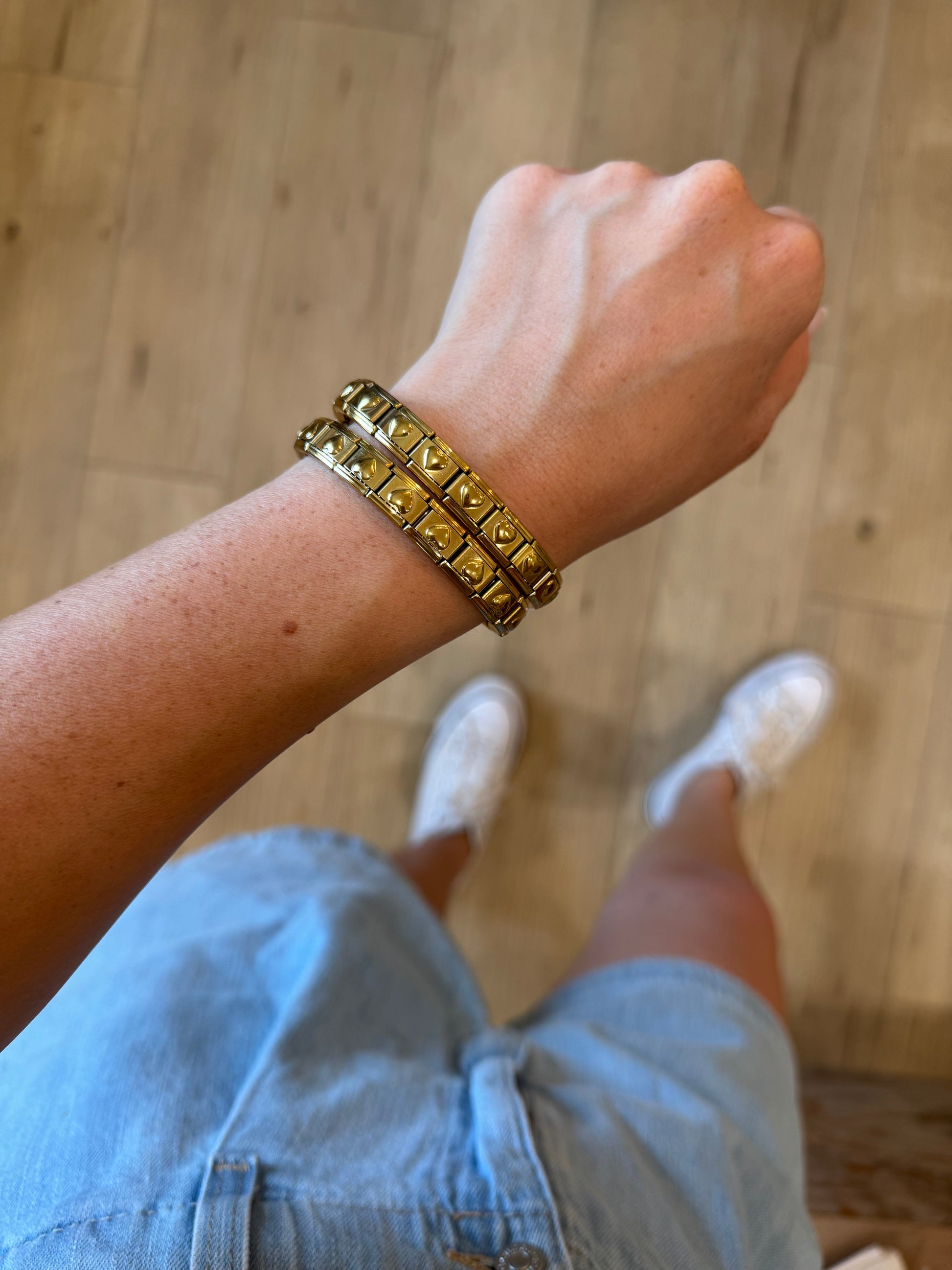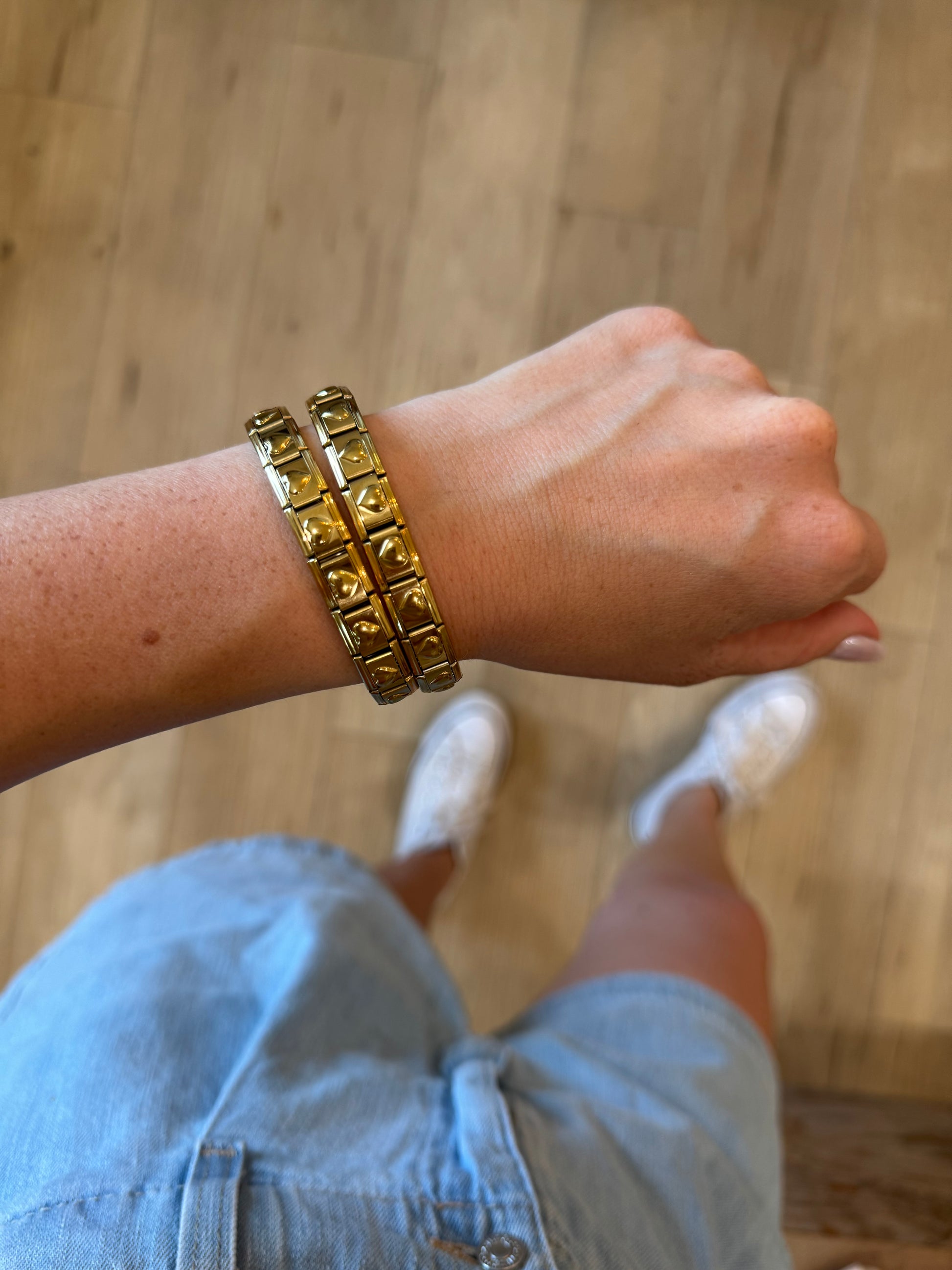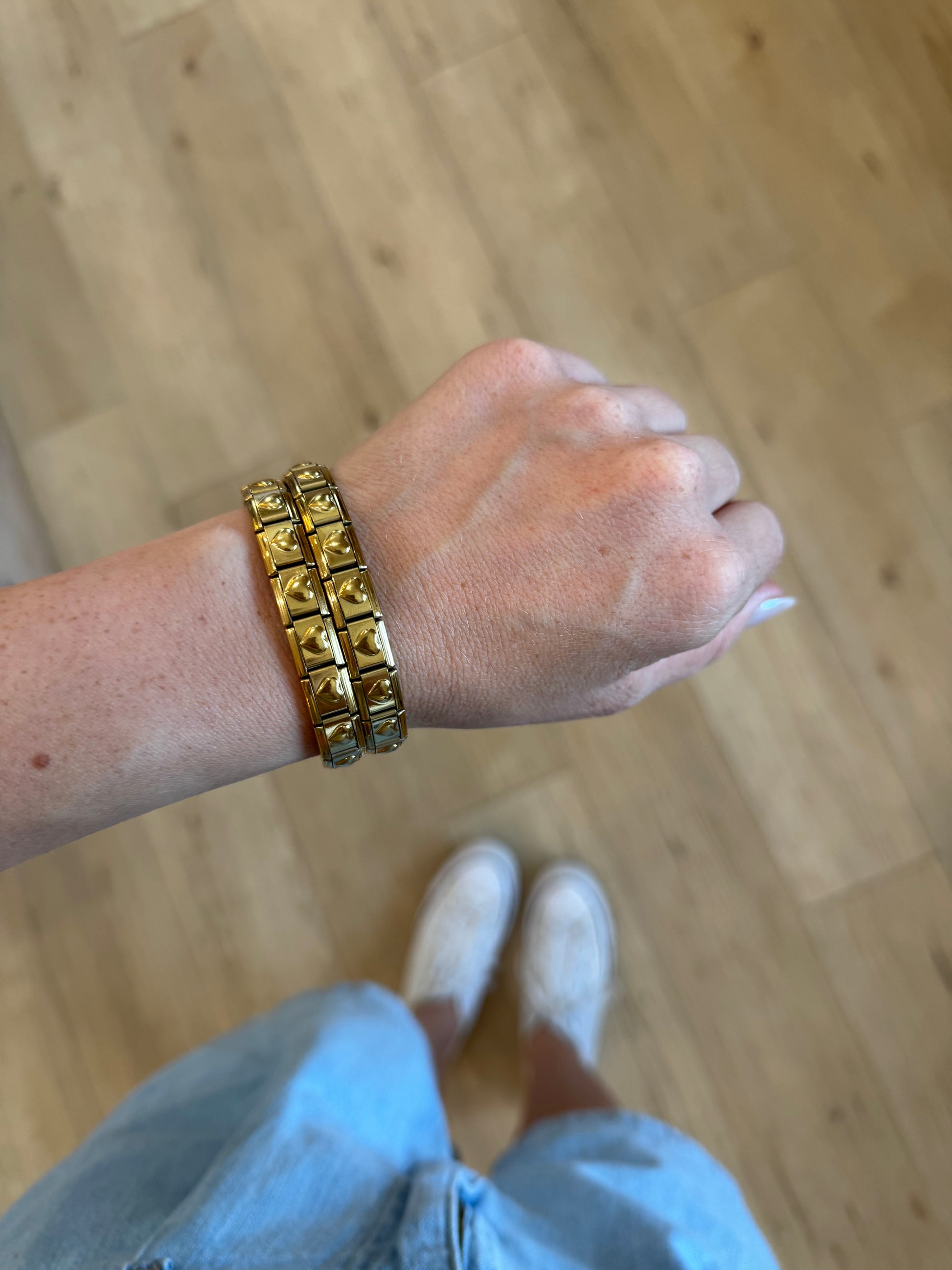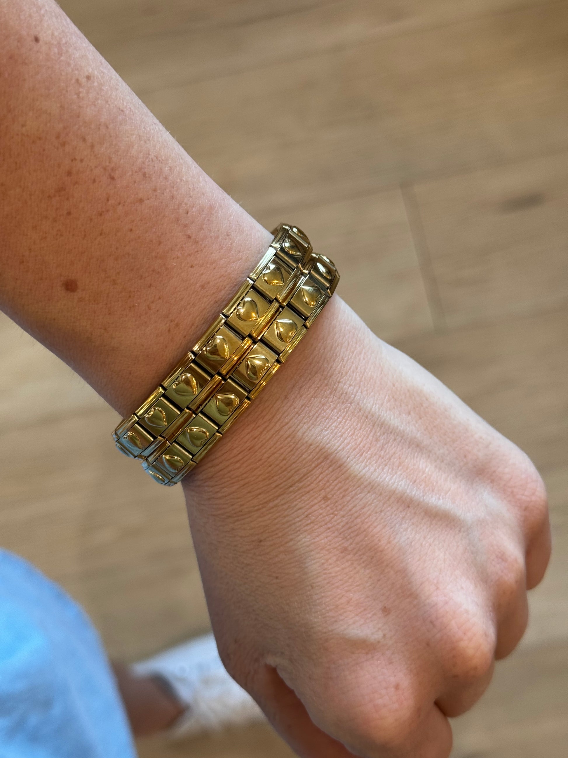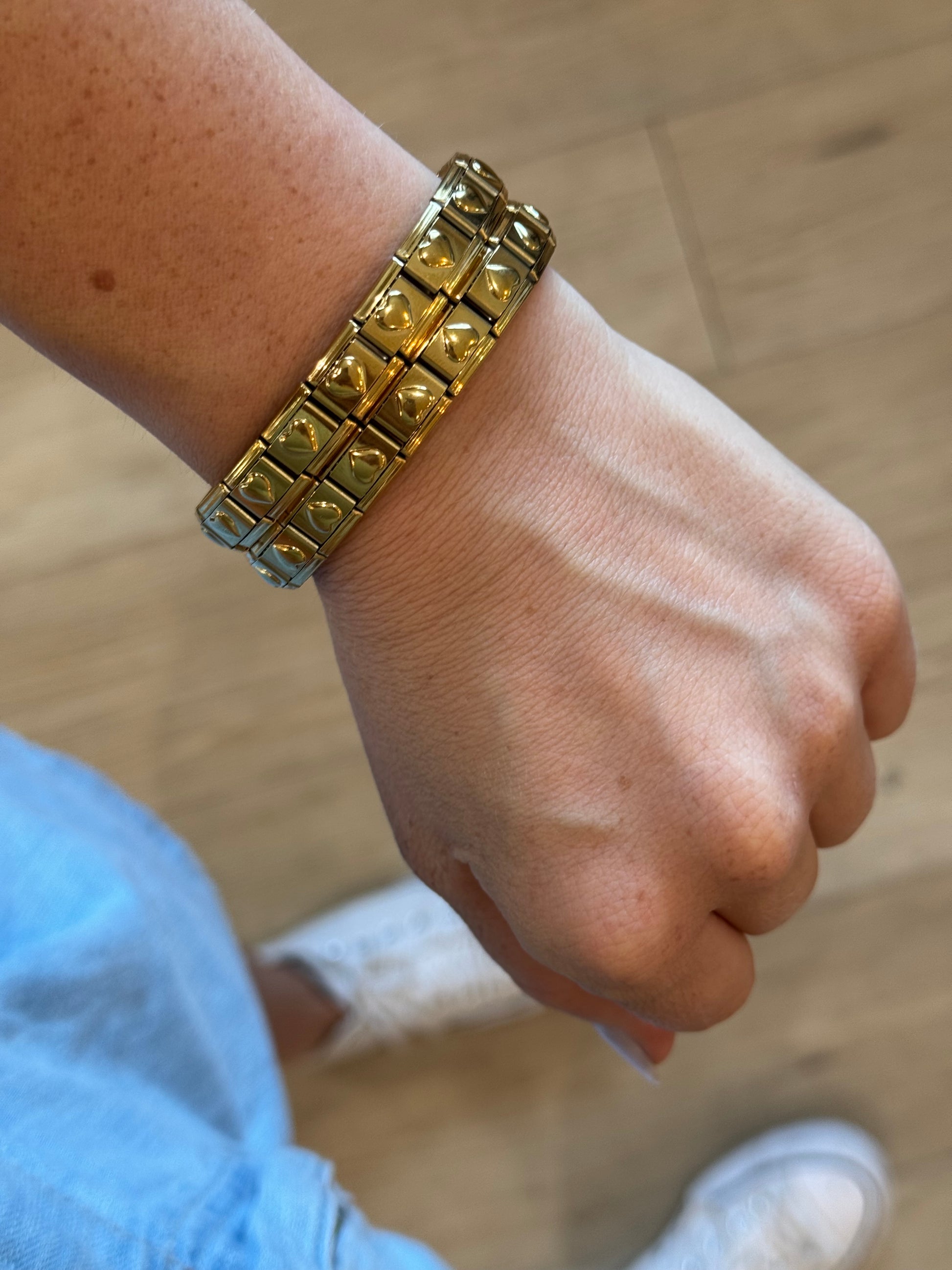 Enhance your everyday style with this set of two Italian charm bracelets, crafted from durable stainless steel and finished in a luxe gold tone. Each link features a raised heart design, adding a touch of romance to their sleek, modern look. The stretch-link construction ensures a comfortable fit for most wrists, making them perfect for stacking or wearing solo. Timeless, versatile, and effortlessly chic, these bracelets transition seamlessly from casual days to dressed-up nights.