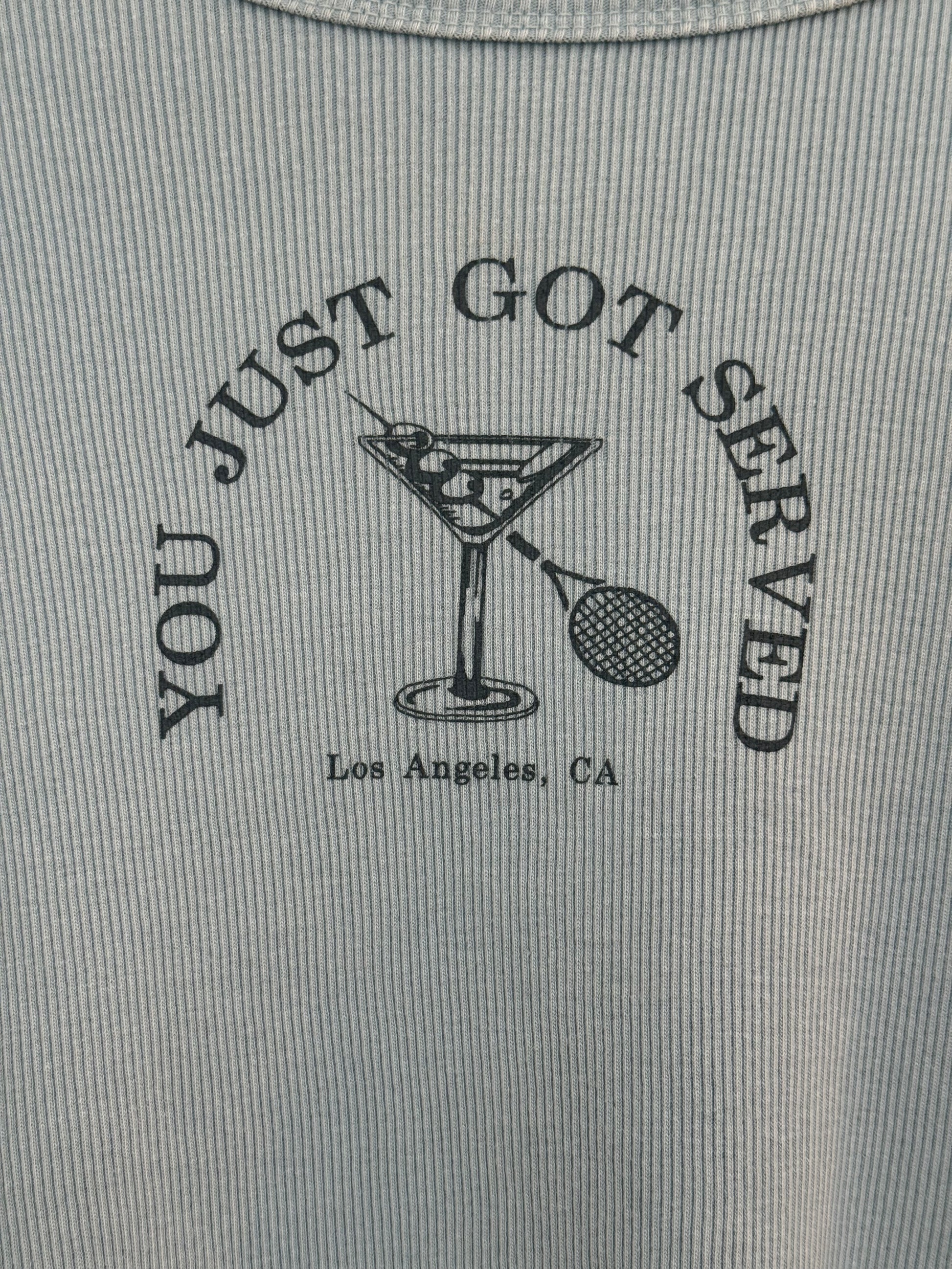 - Graphic print: “You Just Got Served” with martini + Los Angeles text